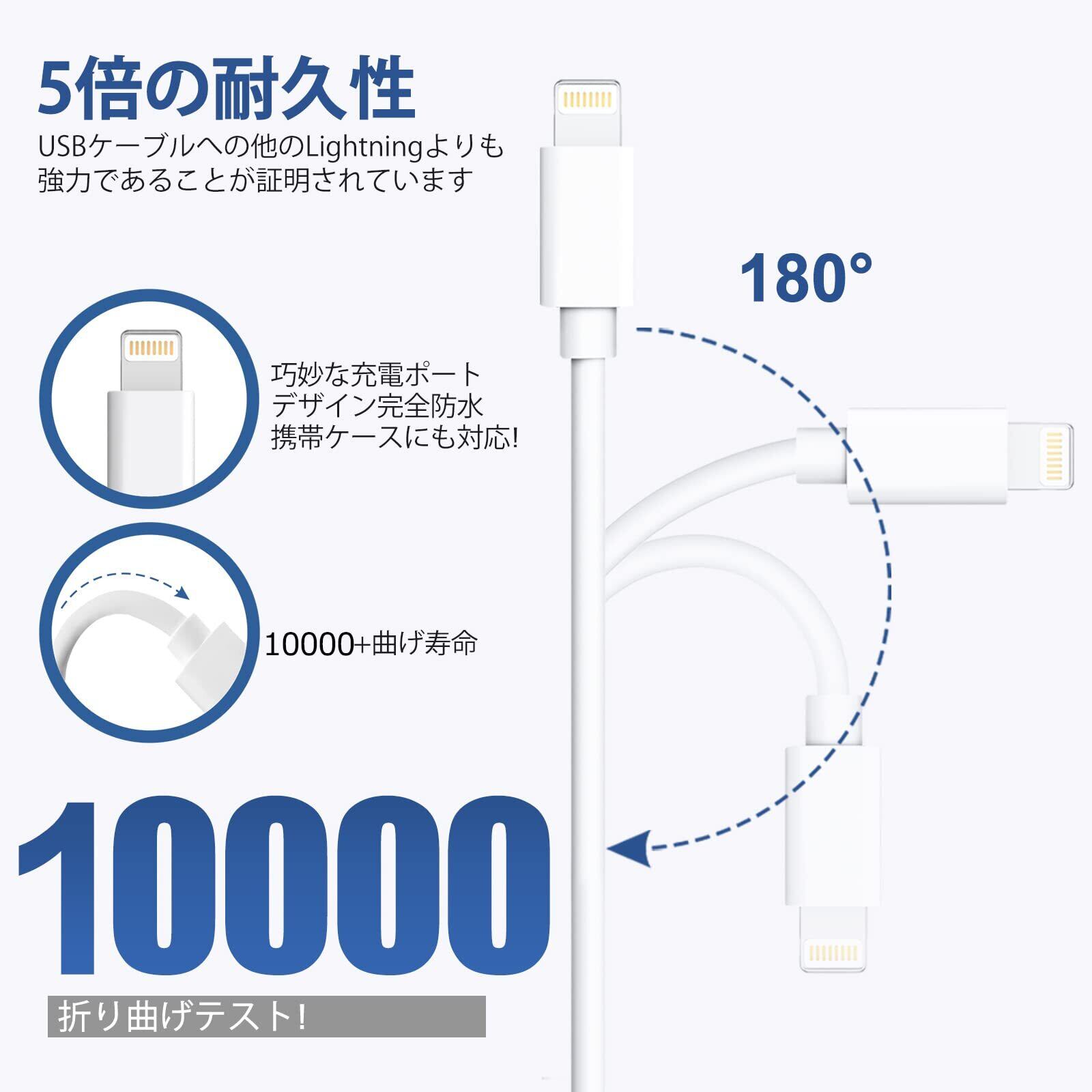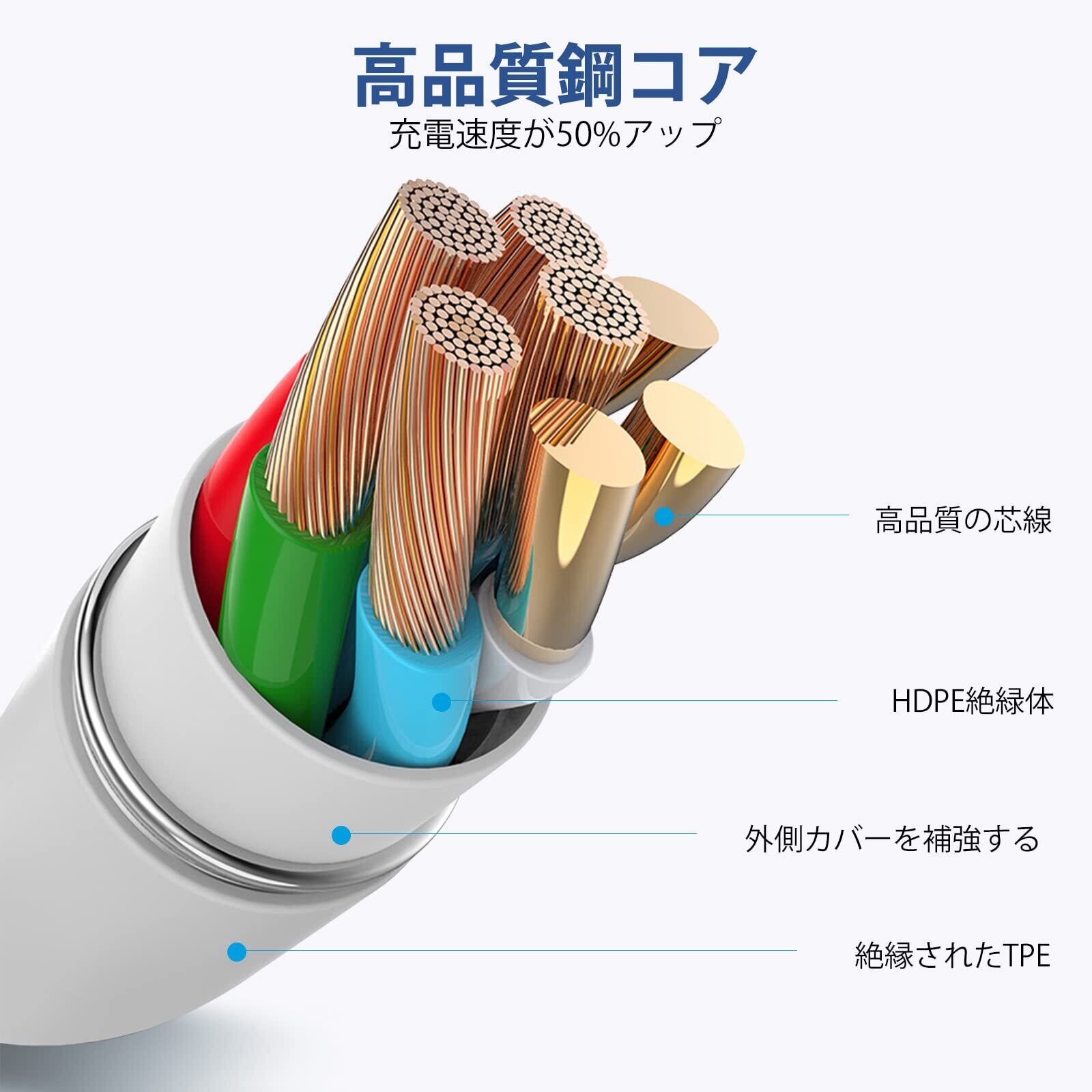 究極の耐久性・高品素材:弊社のiphone充電器ケーブルは耐久性を高めるため、USB側先端に保護層を追加し、外部は優れたTPE素材で覆われ、伸びが良いです。内部の無酸素銅には、アルミニウム箔なども劣化しにくく、耐摩耗性も優れています。コネクタの根元も耐久性に優れた構造で、一般的なケーブルよりも10倍以上耐久性が高く、安心して充電できるiphone充電器ケーブルです。