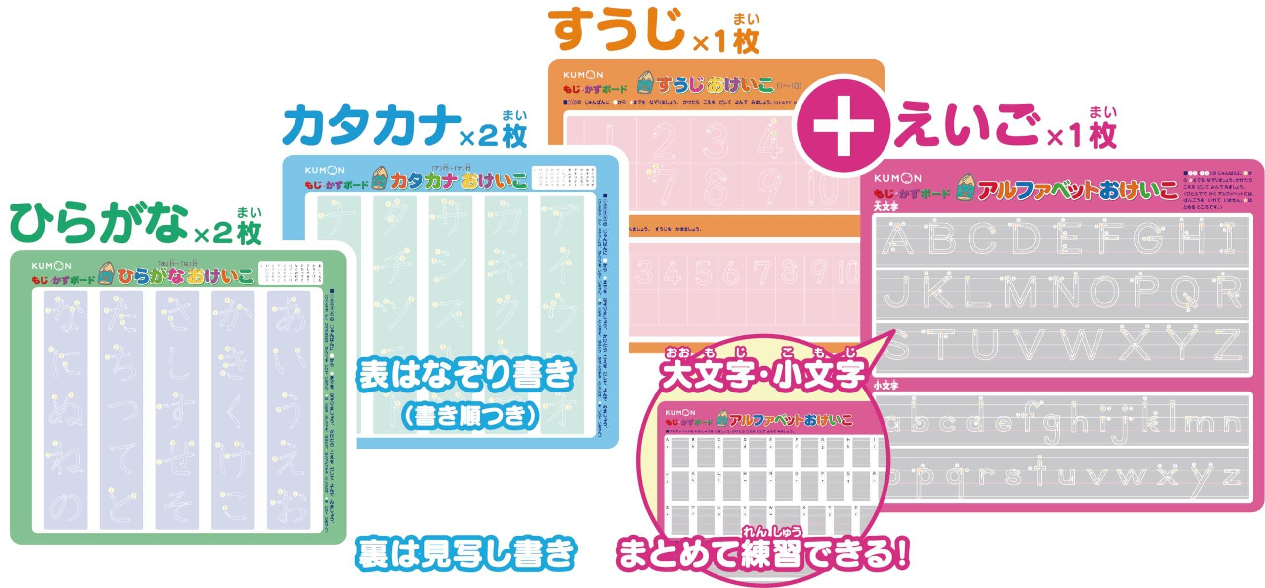 セット内容:ひらがなボード2枚 、カタカナボード2枚、すうじボード1枚、えいごボード1枚、三角アクアペン2本