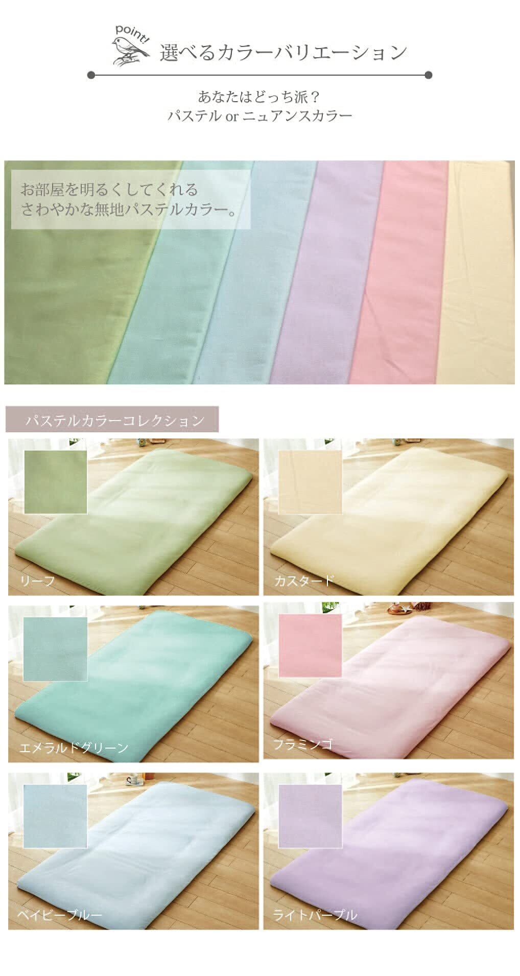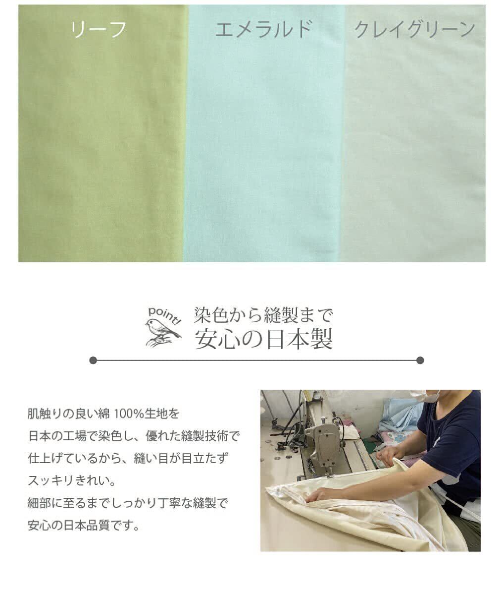 肌触りの良い日本製の綿100%の生地を使用したベッドウェアです。 シーツはゴム式ですのでお一人で簡単に掛けやすく、どんなお布団やお部屋にも合うお色味をご用意!