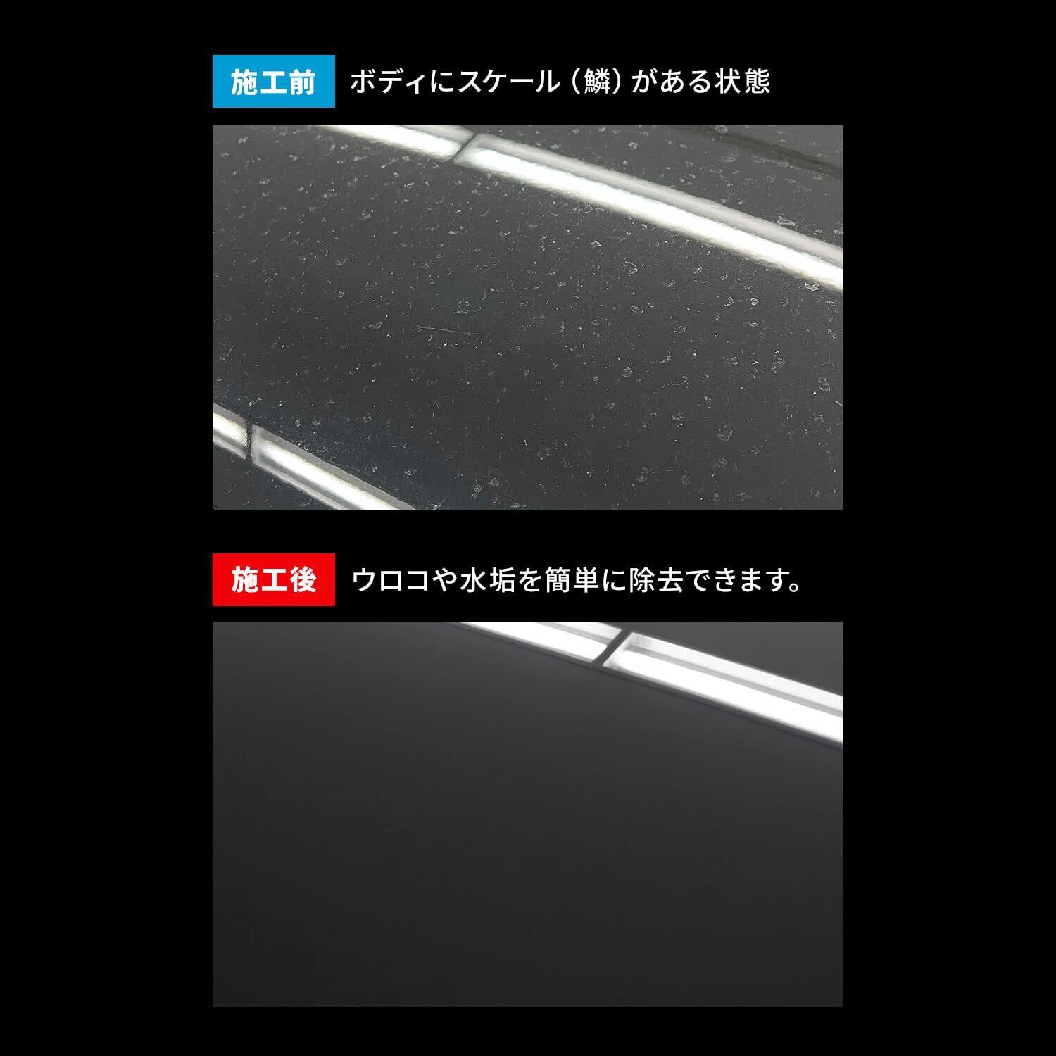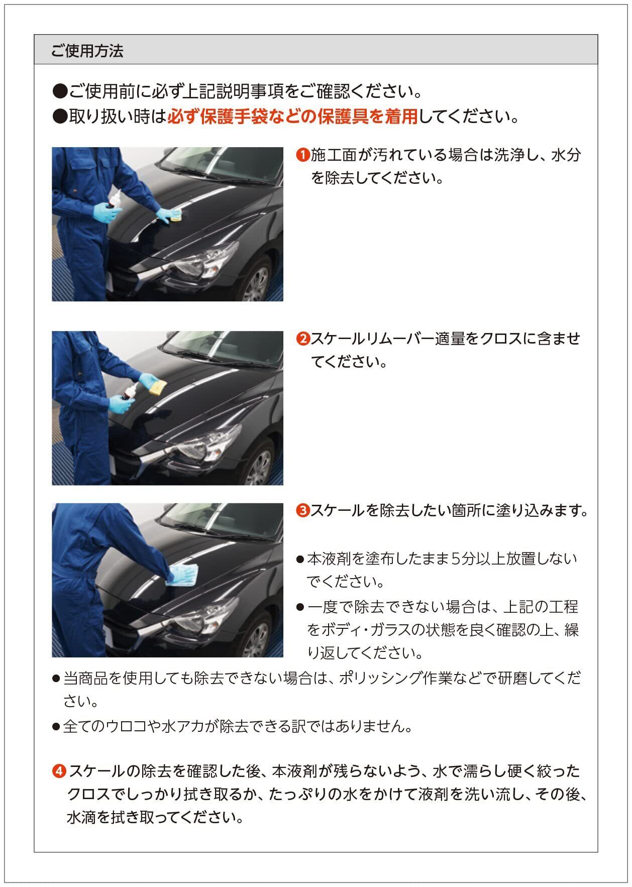 水垢やウロコを簡単除去するスケール除去材(水垢落とし)です。クリア塗装されているボディやウィンドウガラスに付着したウロコや水アカを簡単に除去することができます。特にスポット的なシミ除去に効果を発揮します。