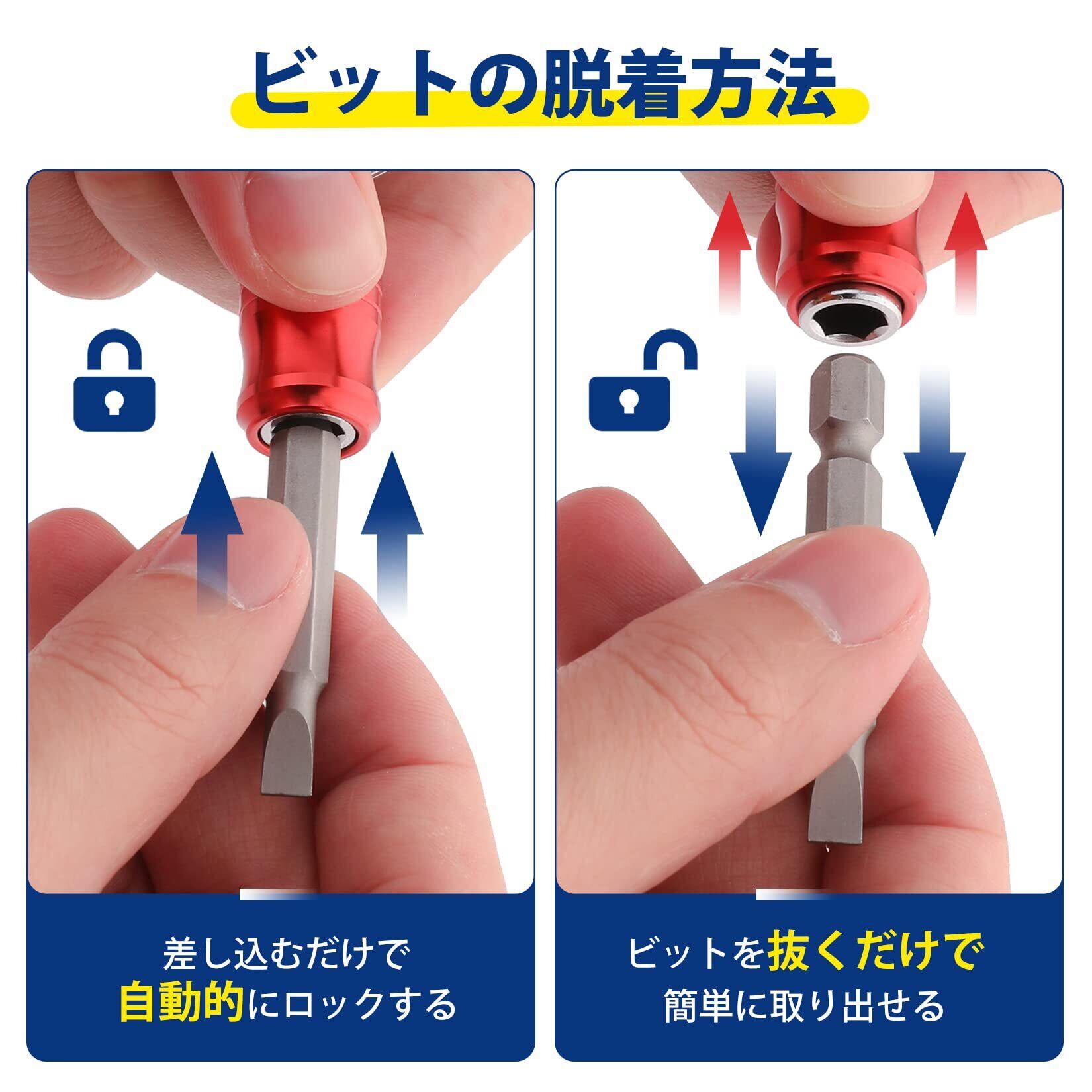 【着脱便利】ビットをしっかりとロックして固定できます。差し込むだけで便利に装着し、片手で抜けば外すことができます。脱落や紛失を有効的に防げます。