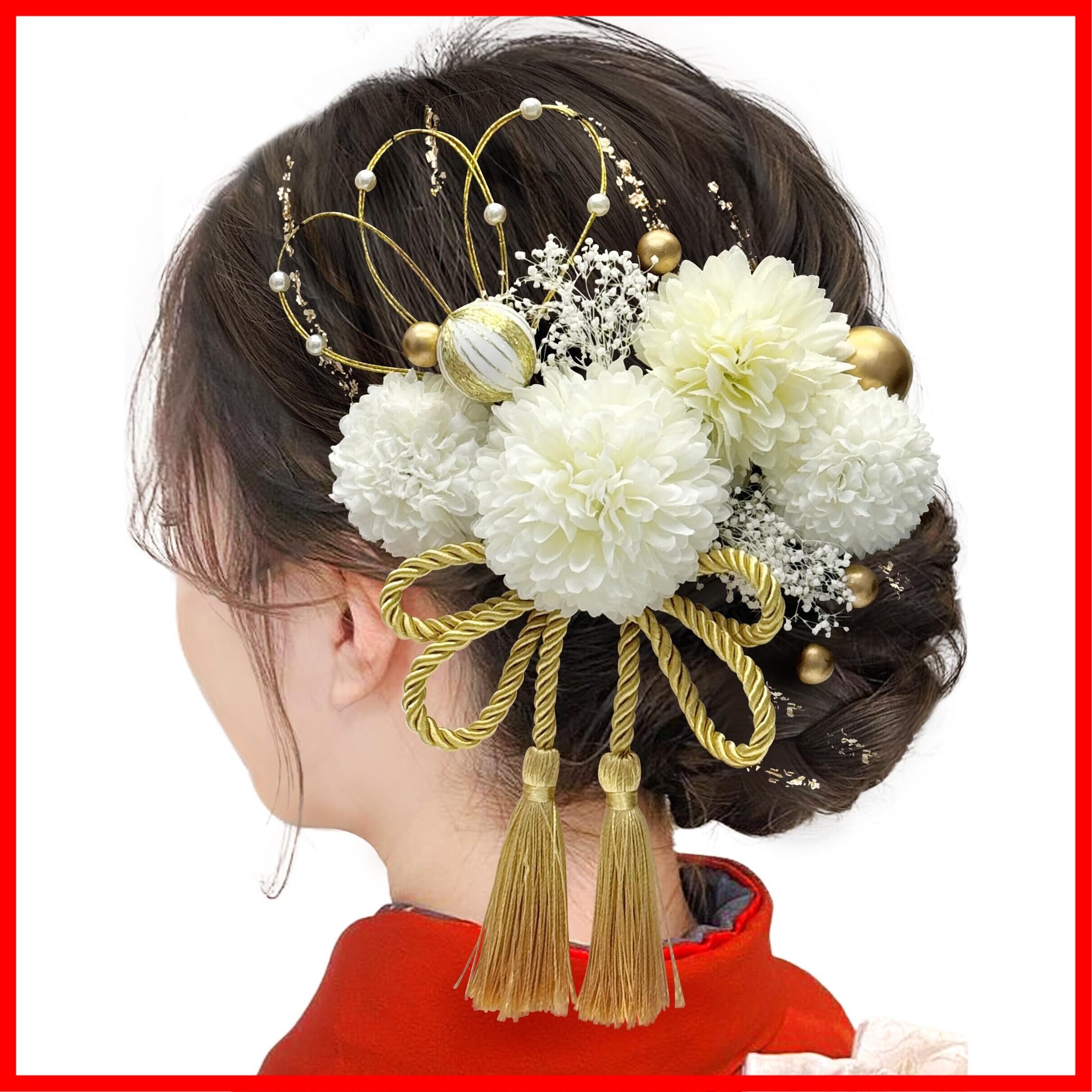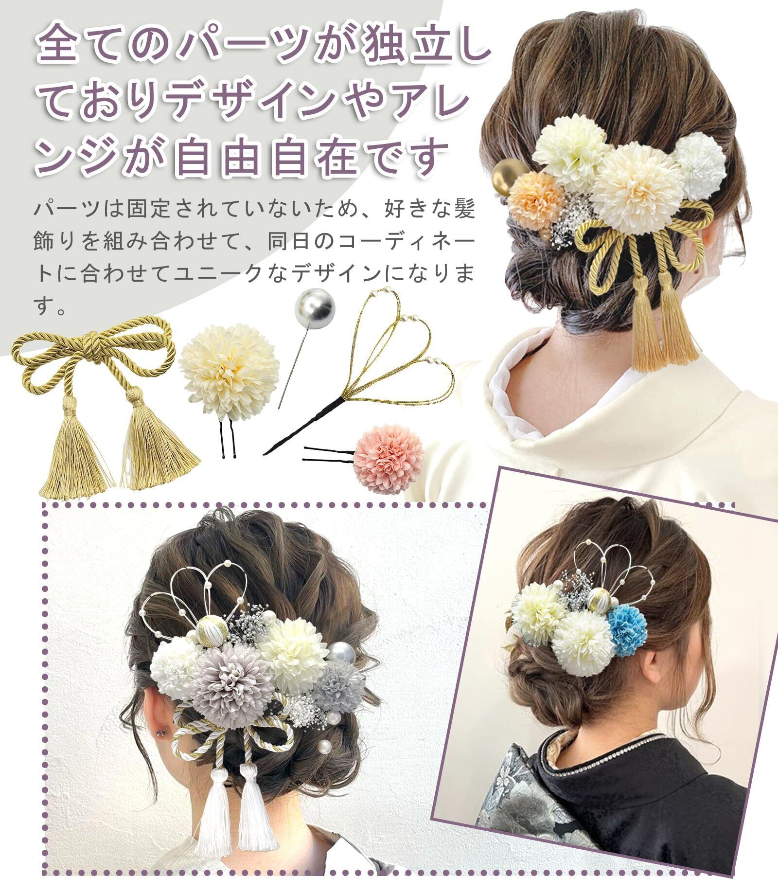 成人式 髪飾り【12色展開】 ピンポンマム 紐 ドライフラワー 七五三 浴衣 袴 着物 飾り 振袖 和装 卒業式 結婚式 水引 かすみ草 造花 手作りかわいい 白 F3710