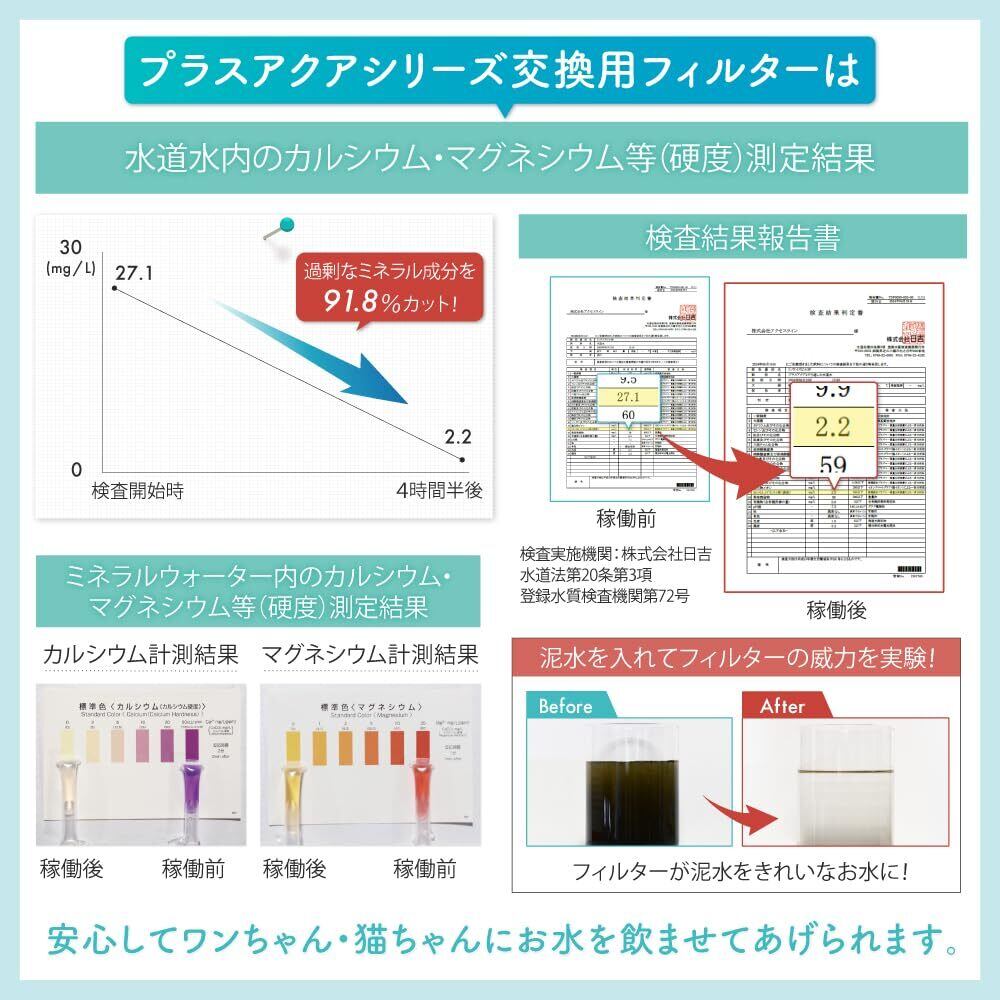ご存じですか?地域によっては水道水にミネラル成分が多く含まれていることがあります。ミネラルが多い水を飲み続けるとワンちゃんや猫ちゃんの胃腸や腎臓。下部尿路などへの健康リスクが高まる可能性があります。 そこでおすすめなのが「プラスアクアシリーズ交換用フィルター」です。浄水ろ過フィルターでミネラルや塩素を大幅にカットし、ワンちゃん猫ちゃんの身体への負担を軽減したおいしいお水を提供します。 ABS樹脂製の本体に高密度マイクロ綿、ヤシ殻活性炭、イオン交換樹脂、KDF(銅と亜鉛の合金)を組み合わせた高品質な浄水フィルターです。
