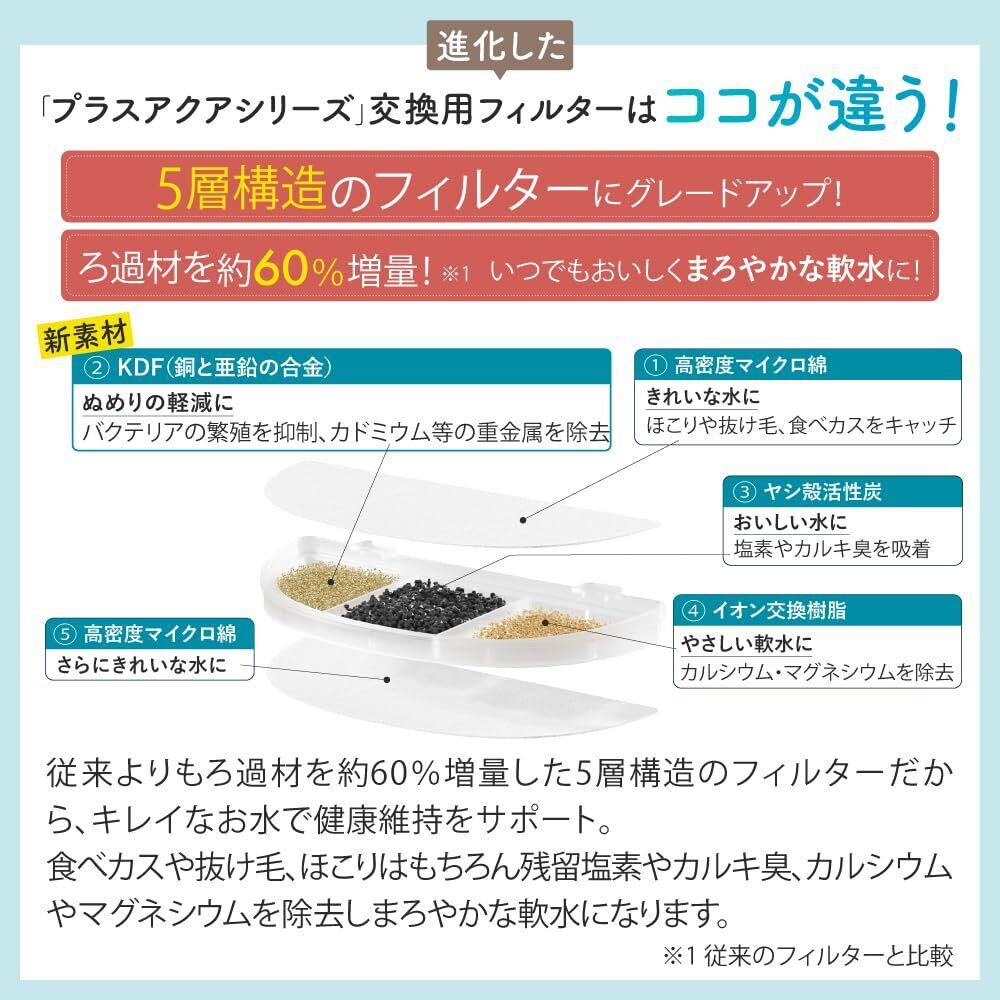 進化したプラスアクアシリーズ交換用フィルターはココが違う! 5層構造のフィルターにグレードアップ!・ろ過材を約60%増量!いつでもおいしくまろやかな軟水に! 新素材KDF(銅と亜鉛の合金)はバクテリアの繁殖を抑制するのでぬめりの軽減に!さらにカドミウムなどの重金属を除去 従来のフィルターよりもキレイなお水で健康維持をサポート