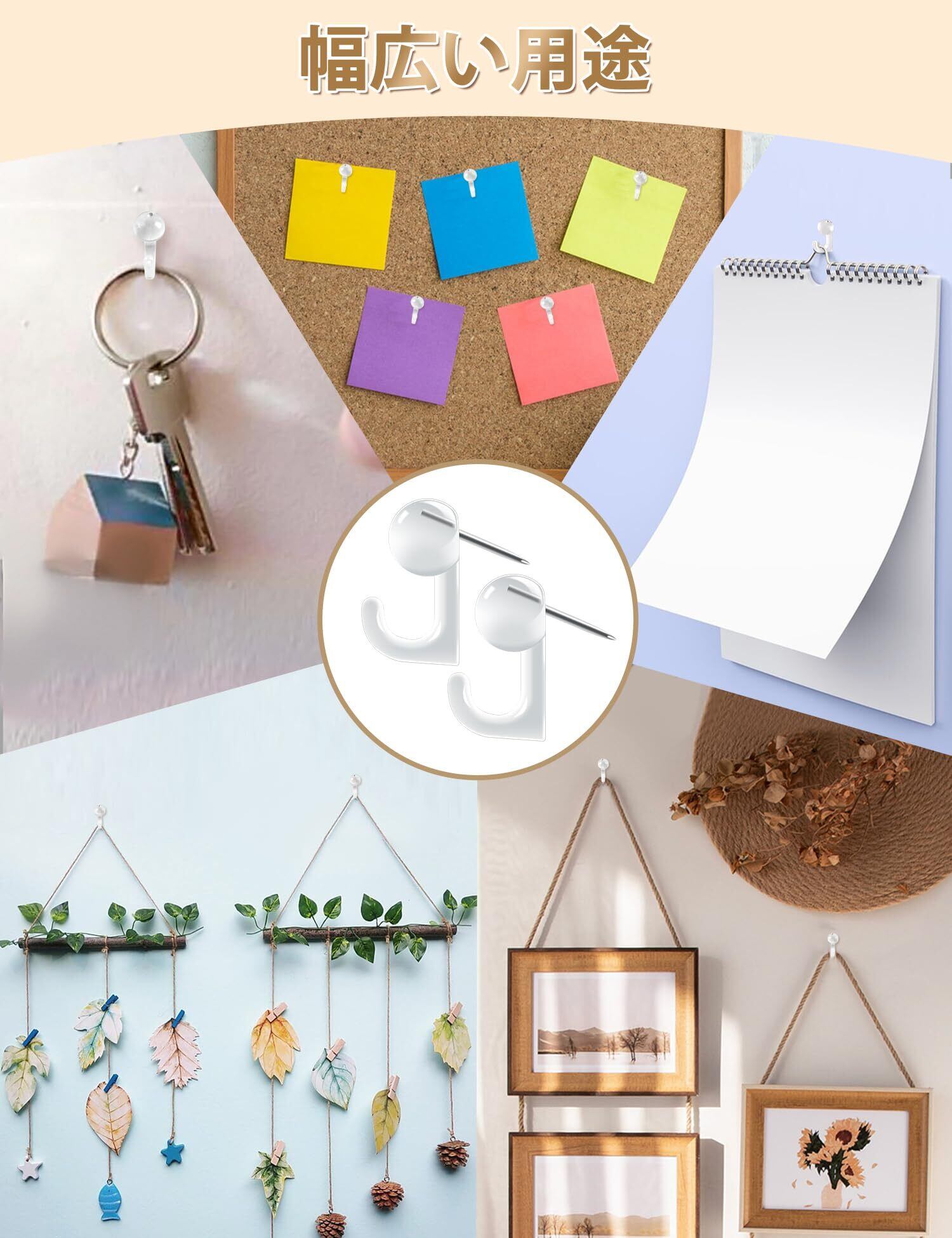【幅広い用途&適用壁】画鋲フックの用途は非常に広く、いろいろなものをかけるのに便利です。たとえば、写真立て、カレンダー、鍵、ハサミ、台所道具などです。自宅やオフィス,キッチン,玄関,学習室などに幅広く活用できます。ピンフックは、合板、板、石膏ボード、密度板などの壁に使用できます。 注意:セメントやセラミックの壁には使用できません。