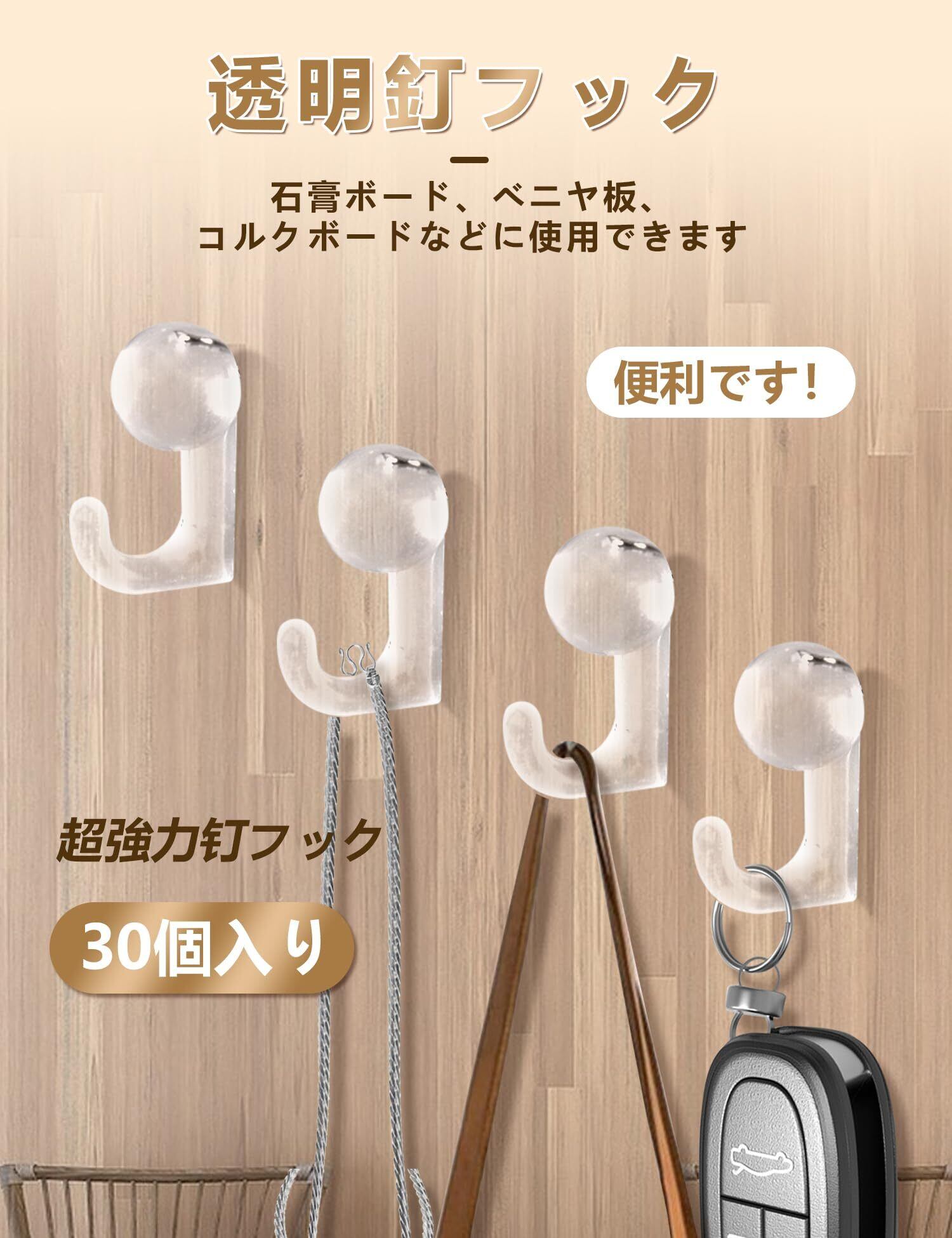 【取付簡単&製品仕様】壁によっては、手で押したり、ハンマーで叩いたりできます。インストールはとても簡単です。製品仕様:透明フック*30、透明収納ケース*1、耐荷重約1kg。