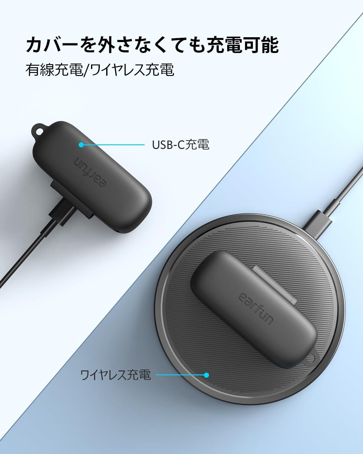 【空洞設計】充電口の挖り込みデザインで、保護カバーを外す必要なくいつでもどこでも充電できます。イヤホンのすべての機能を通常通り使用できます。