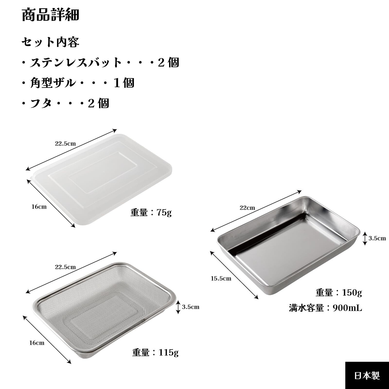 ●セット内容:バット×2、フタ×2、角型ザル×1、取扱説明(個装箱裏面)●本体サイズ(約):バット/幅22×奥行 15.5×高さ 3.5cm、フタ/幅 22.5×奥行 16×高さ 1cm、角型ザル/幅22.5×奥行 16×高さ 3.5cm●満水容量(約):900mL●材質:バット・角型ザル/ステンレス鋼、フタ/ポリエチレン(耐熱温度:80℃・耐冷温度:-20℃)●重量(約):バット/150g、角型ザル/115g、フタ/75g●原産国:日本