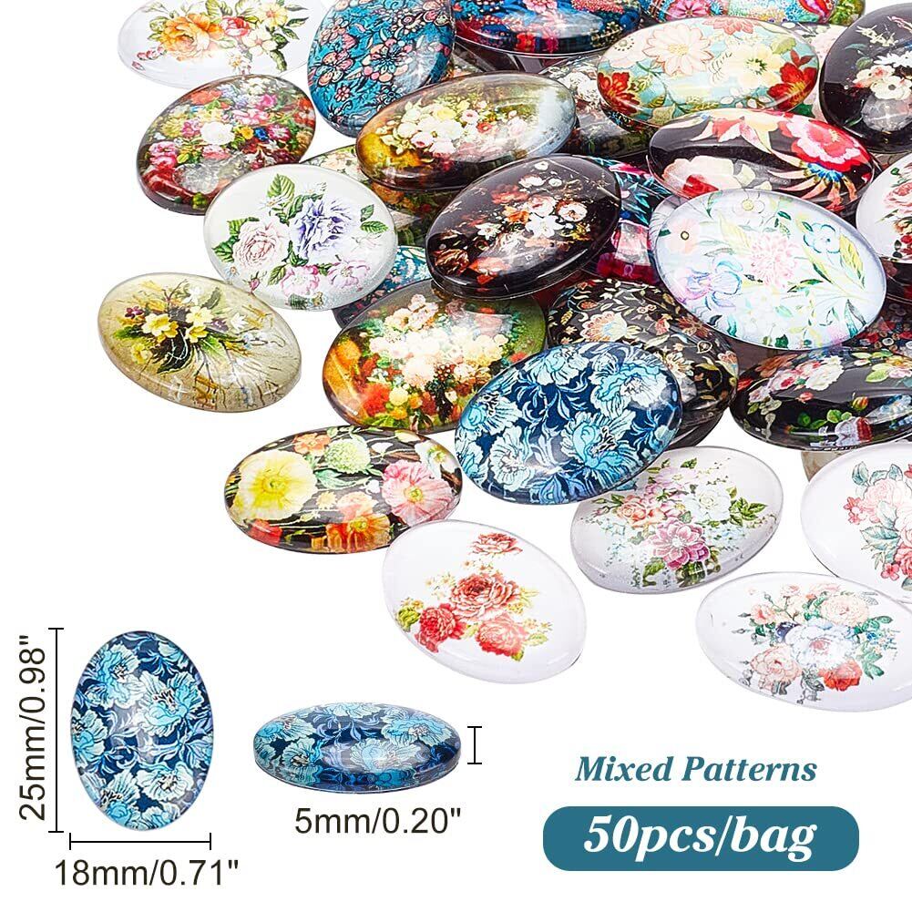 PH PandaHall 50個セット カボション 25x18mm ミックス ガラスカボション 帯留め作り オーバルビーズ 拡大レンズ効果 花柄 デコパーツ ジュエリー用 手芸用品 着物の装飾 アクセサリーパーツ 手作り 材料 素材