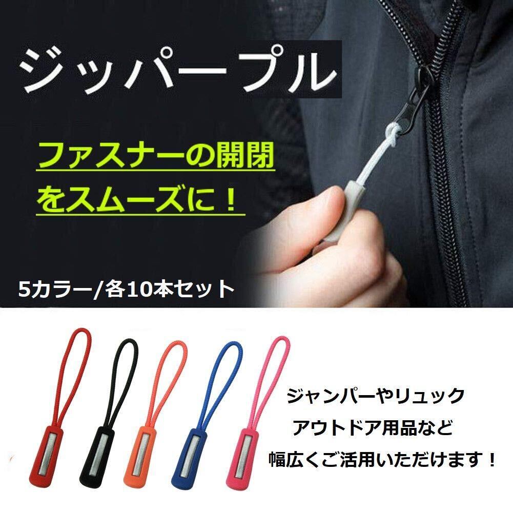 ファスナーの開け閉めを楽にするジッパープル、5カラー各10本セットです。ファスナーの引手に取り付けることで持ち手が長くつかみやいタブなります。手袋をしたままでもスムーズにプルアップが可能になり大変便利です。