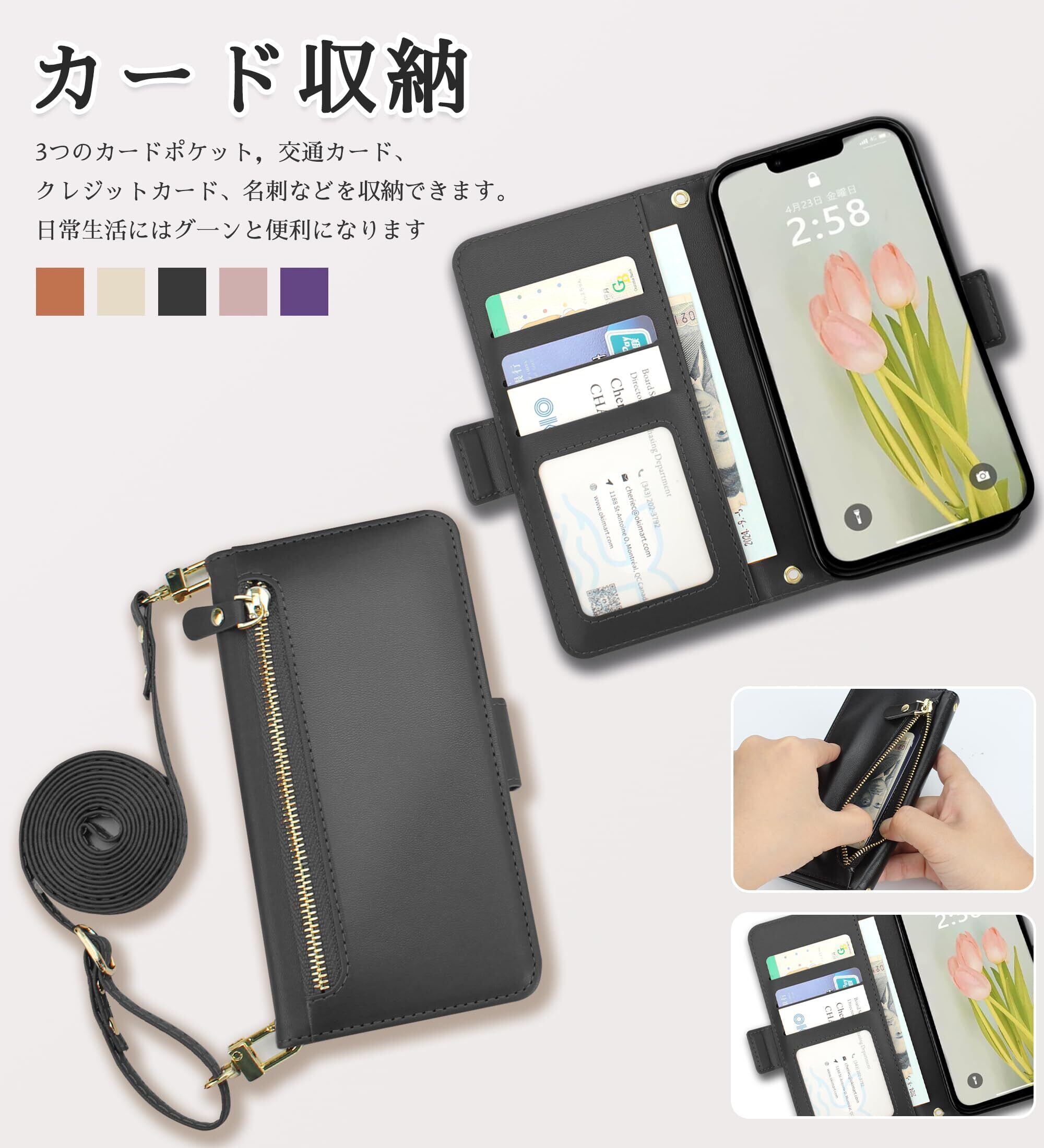 CLICSUN iPhone 13 ケース 手帳型 ショルダー いphone 13 斜めがけ ケース 財布型 携帯ケース アイフォン 13 肩掛け 小銭入れ カード収納ロングストラップ 長さ調節可能 衝撃吸収 ICカードホルダー PUレザー (ブラック) | hananoki