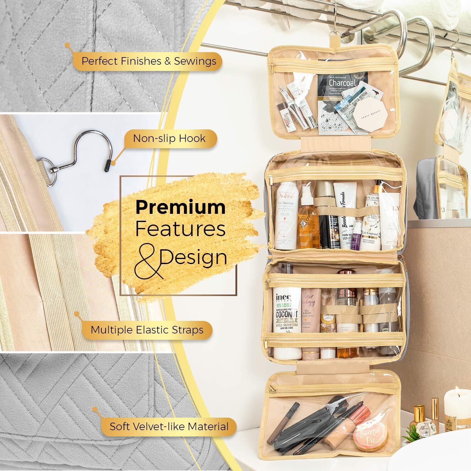 旅行の必需品を整理し、安全に保管できる丈夫な折りたたみ式・吊り下げ式アメニティバッグ。防水性と撥水性に優れ、フォーム層による追加の保護機能も備えています。