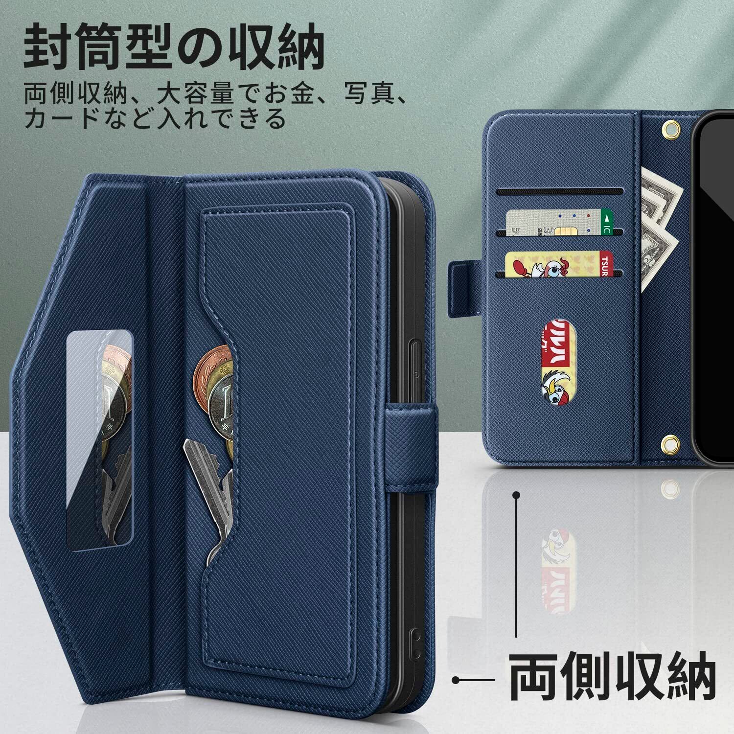 【カード収納】iPhone15スマホケース内部には4つのカードスロットを装備し、貴重なカードや軽いレシートなどを収納することができます。外側のサイドポケットには、小銭や鍵など日常生活で必要になることが多いものを収納することができます。内ポケットを開ける必要がないので、日常的に気軽に取り出せます。スマートフォン決済が普及し、財布を持ちたくない時代に、財布として使える機能を搭載しました。収納スペースが充実しているので、通勤・通学にも最適です。