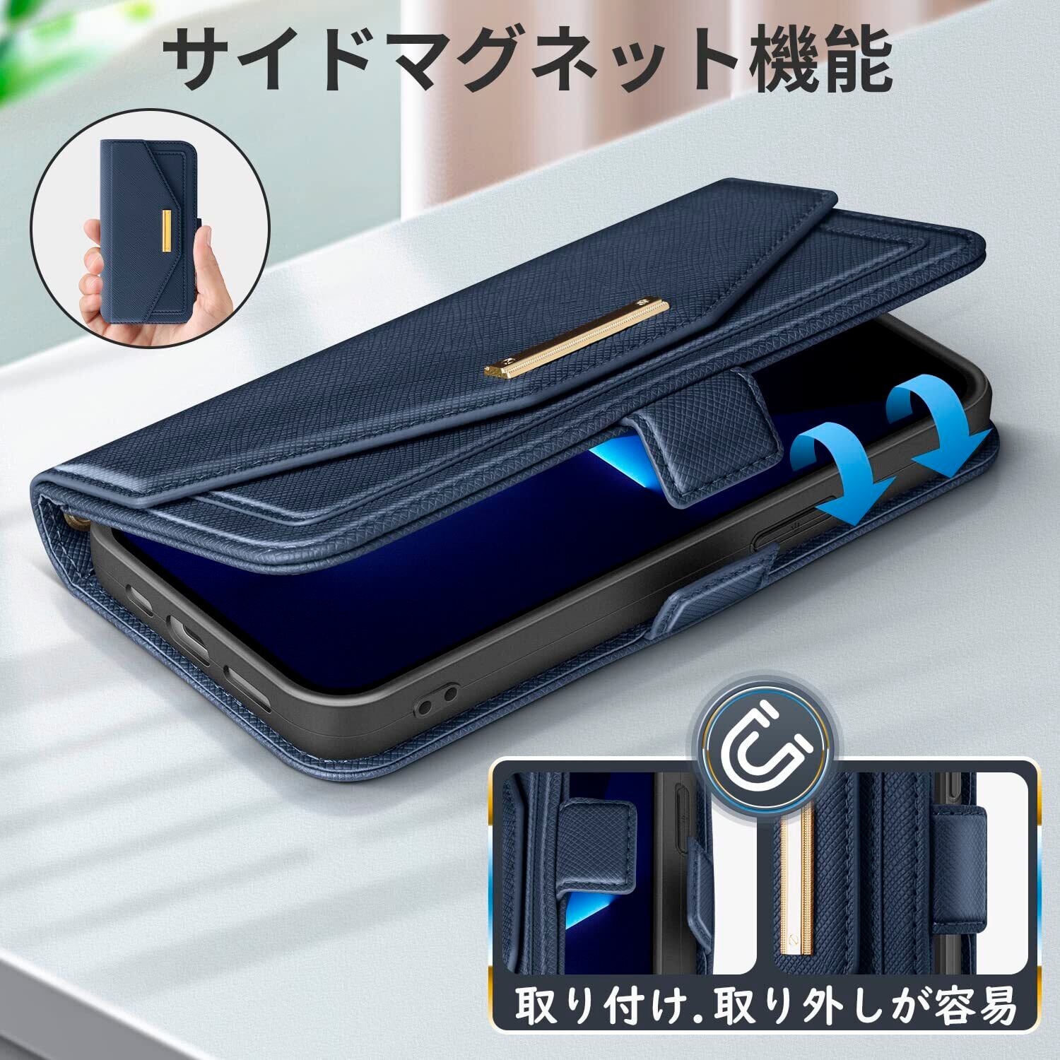 NODALA iPhone 15 ケース 手帳型 アイフォン15 スマホケース 財布型 ショルダー あいふぉん15 携帯ケース 肩掛け 斜めがけ カバー 手帳型 小銭入れ カード収納 ロングストラップ 長さ調節可能 ミラー付き女性 おしゃれ 横置 ステント機能 折りたたみ 耐衝撃 PUレザー ブルー