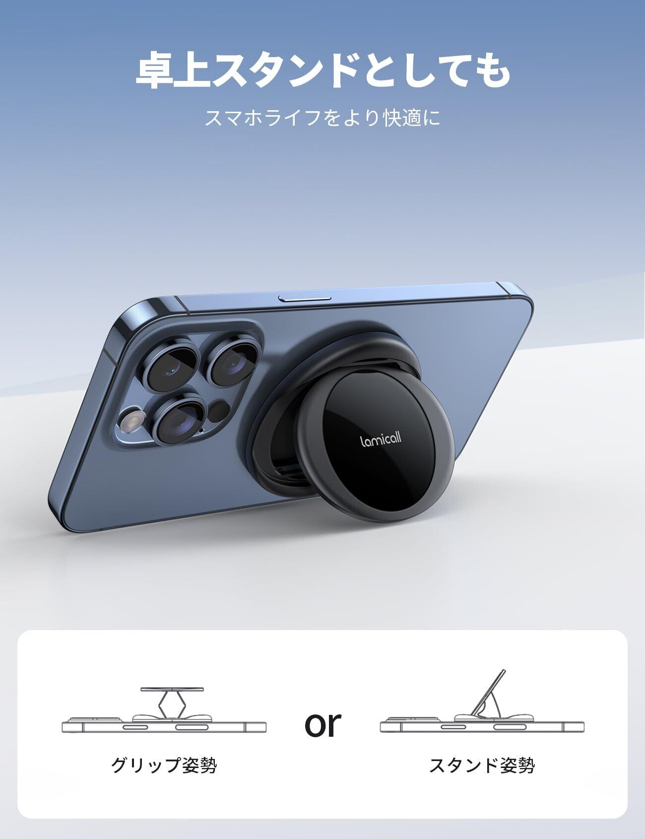 特徴 卓上スタンド, マグネット式, 落下防止, 快適なグリップ感, iPhone 16/15/14/13/12 アクセサリー