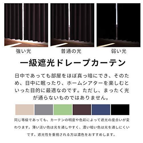 ◆【一級遮光】このカーテンは遮光度が99.99%以上,外からの光をほとんど通さないため、昼間カーテンを閉めたお部屋のなかで相手の顔の表情が分からない程度にまでお部屋を暗くできます。同じ等級であっても、カーテンの明度や色彩によって遮光の度合いが変わります。薄い淡い色は光を通しやすく、濃い暗い色は光を通しにくいです。遮光性を重視される方は濃色をおすすめします。