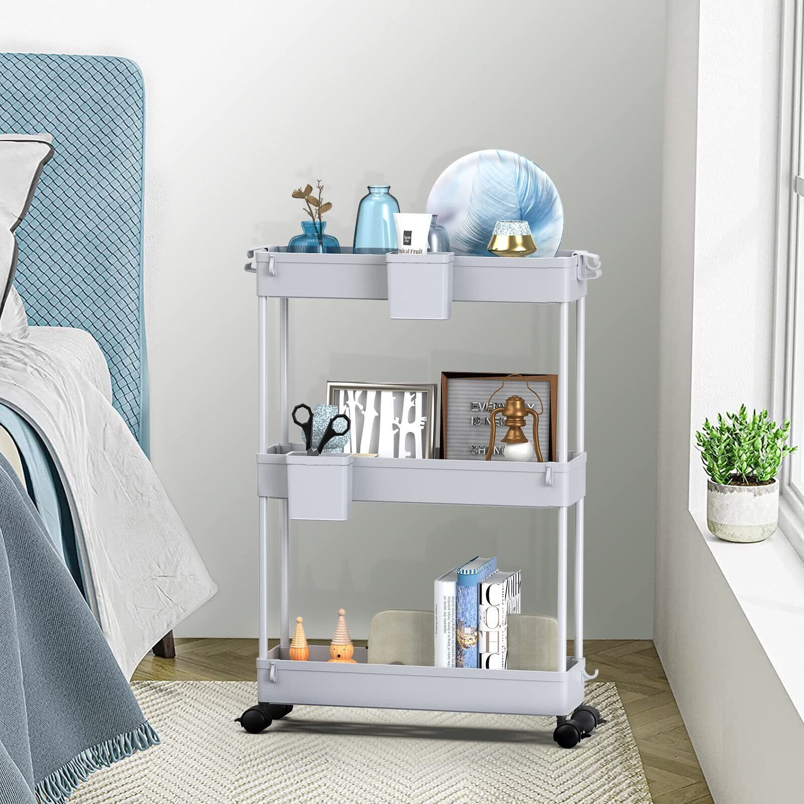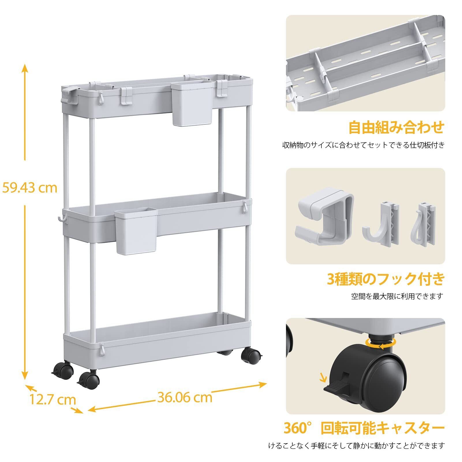 SPACEKEEPER キッチンワゴン 隙間収納 スリム 13cm 収納カップ 仕切板付き 多機能 小物 食品 調味料 キャスター付き 組立簡単 浴室 台所 冷蔵庫横 3段 グレイ | hananoki