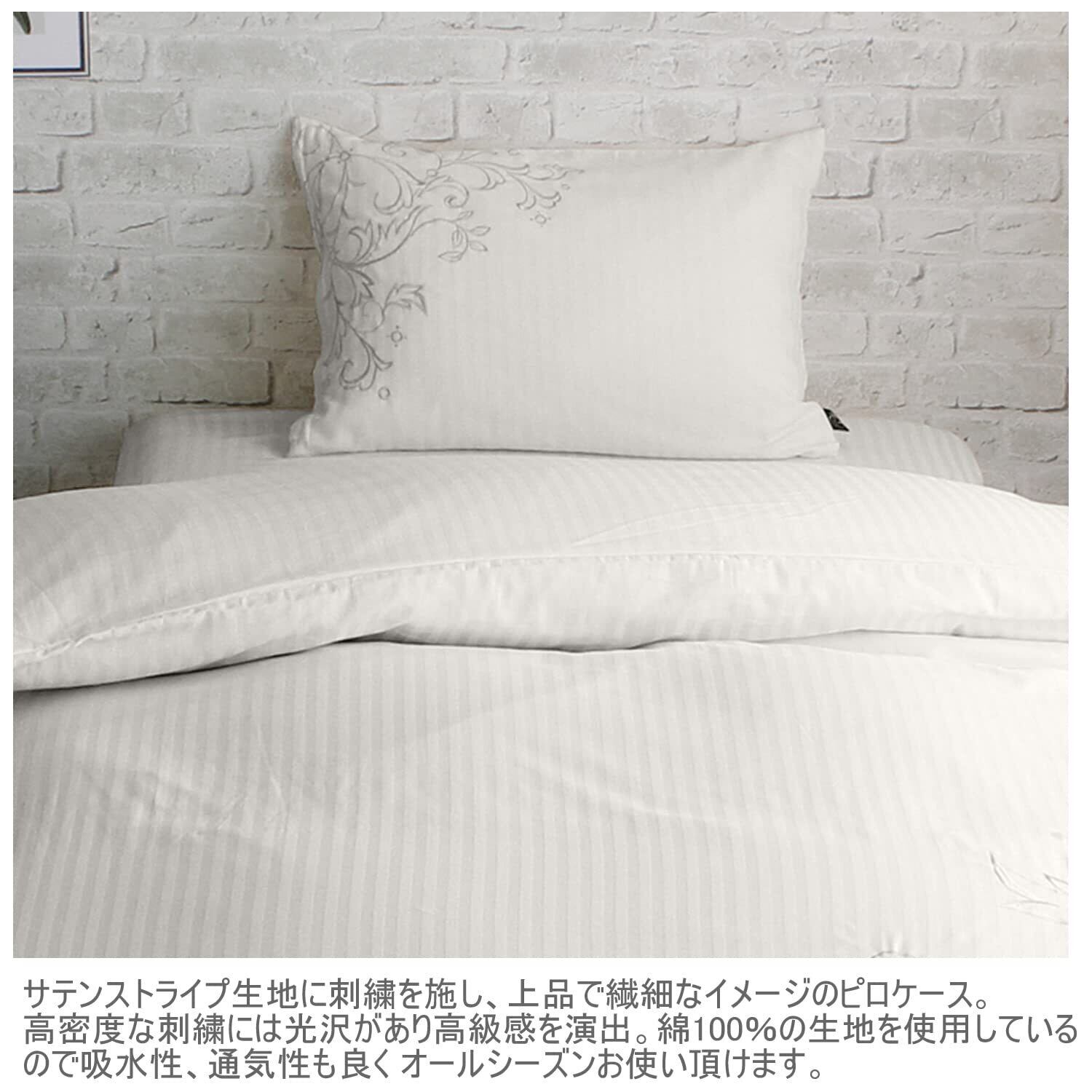サテンストライプに刺繍を施し、上品で繊細なイメージの枕カバー。高密度な刺繍には光沢があり高級感があります。サテンストライプの特長でもある上品な光沢感と滑らかな肌触りがラグジュアリー感のあるベッドルームを演出。綿100%の生地を使用し保湿性、吸水性に優れているのでオールシーズン快適にお使いいただけます。
