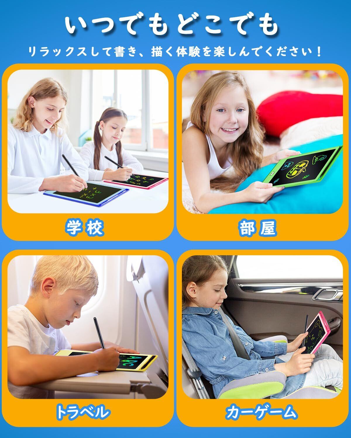 【持ち運び便利】8.5インチのブギーボードは、筆記にちょうど良い面積を確保。目に優しく、長時間使用しても目が疲れません。薄型、軽量、コンパクトで持ち運びに最適、会議、商談、アウトドアでとても実用的です。ご家庭では、伝言板、お絵かきボード、楽しい文房具、メモ帳、電子手帳、漢字練習、学習下書き用紙、計算問題など、学習?筆記ツールとしてもお使いいただけます。