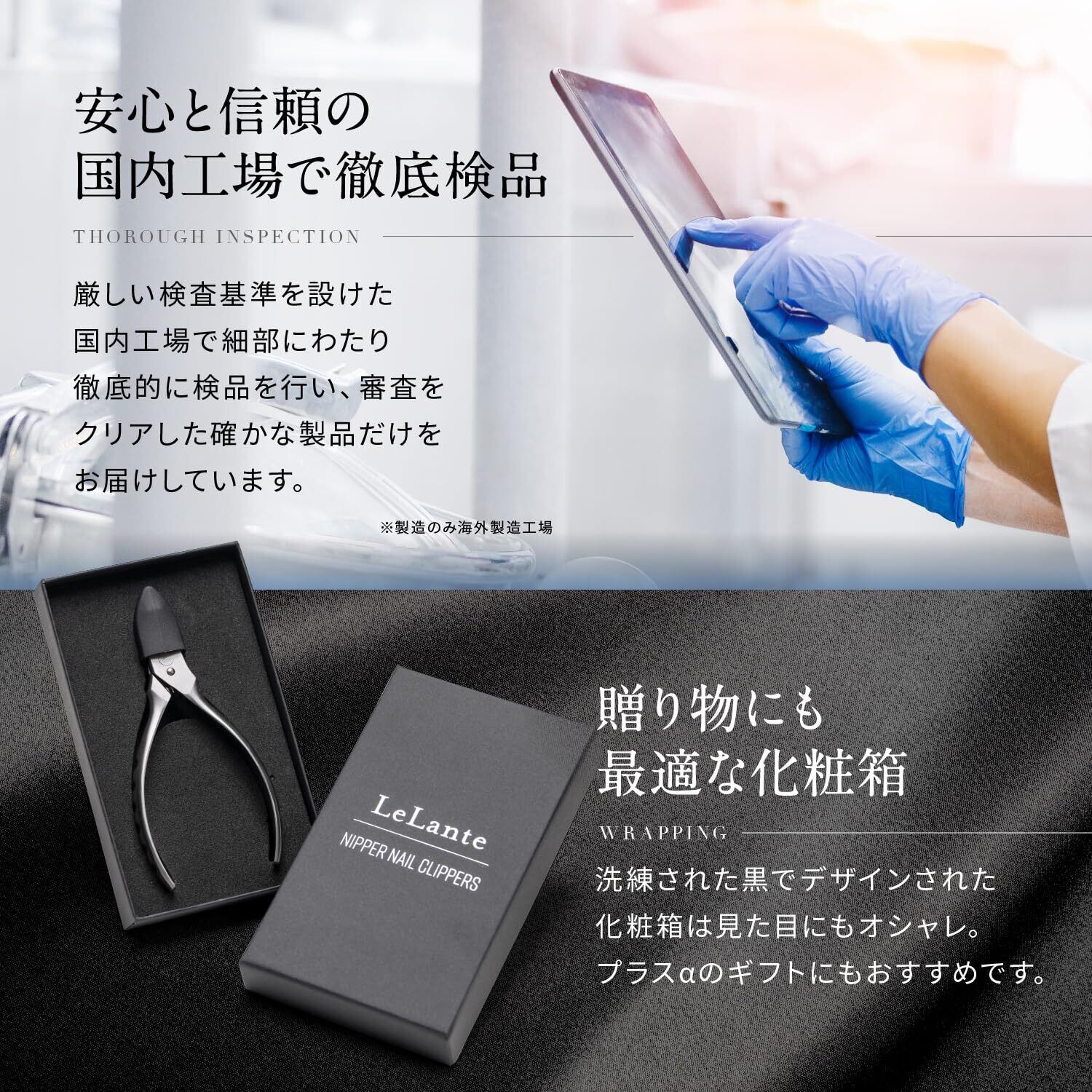 【お客様のお声】LeLante(レランテ)のニッパー爪切りをご使用いただいたお客様から喜びの声が届いております!「スパッと切れて感動した!」「悩みだった巻き爪のお手入れが楽になった!」」「やっと切りやすい爪切りに出会えた!」一般的な爪切りとは全く違う使い心地のニッパー爪切りです!是非一度この使い心地をご体験ください※こちらの商品は足の爪用です。手の爪には「LeLante 爪切り(ガンメタプレミアムブラック)」または「LeLante 電動爪切り」をおすすめしております。