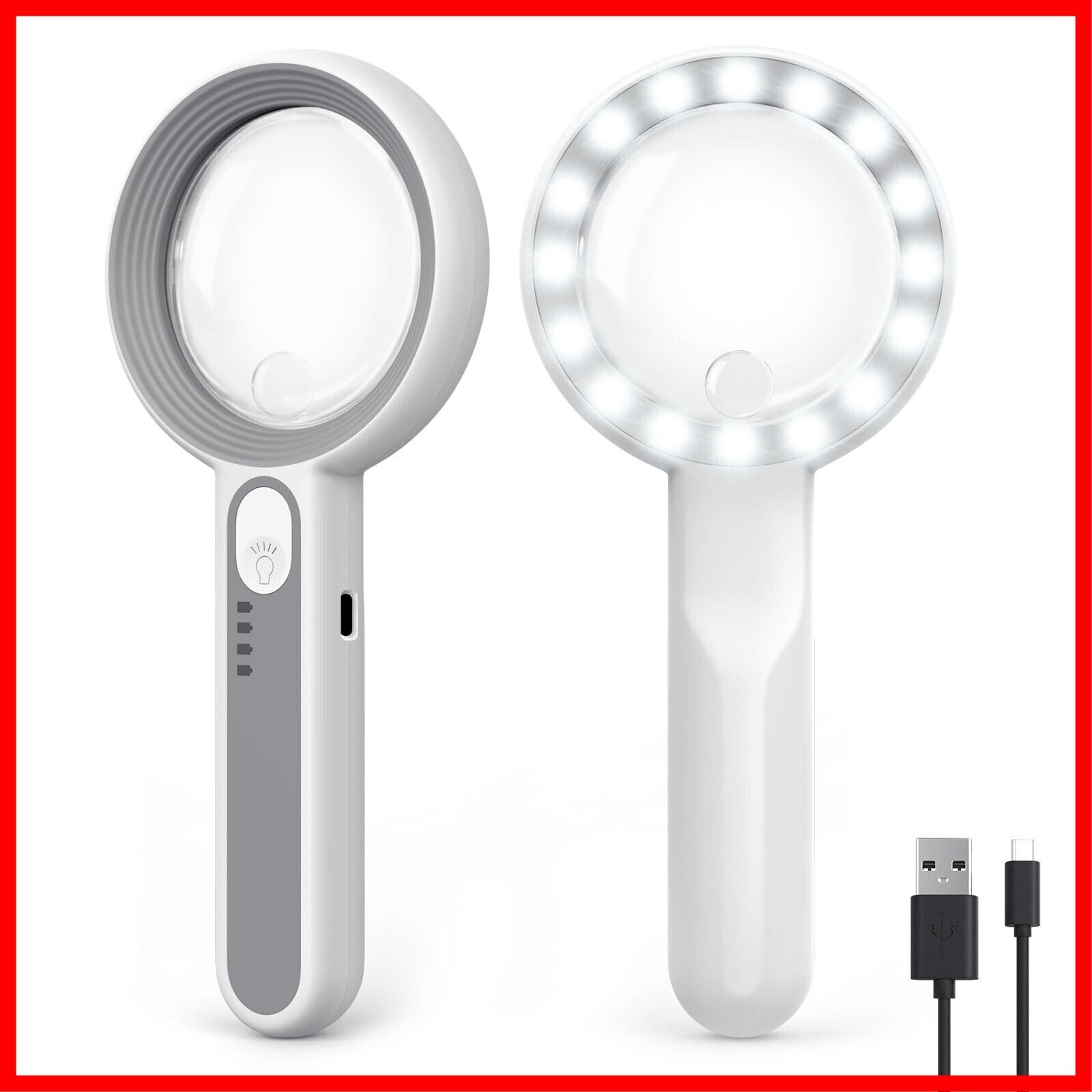 MoKo ルーペ 手持ちルーペ LED付き USB充電式 虫眼鏡 拡大鏡 6+12倍高倍率 2in1 デュアルレンズ 読書用拡大鏡 ハンドヘルド 60mm内径 光学ガラスレンズ 耐衝撃 新聞 コンパクト 携帯便利 細かい作業 昆虫/植物観察
