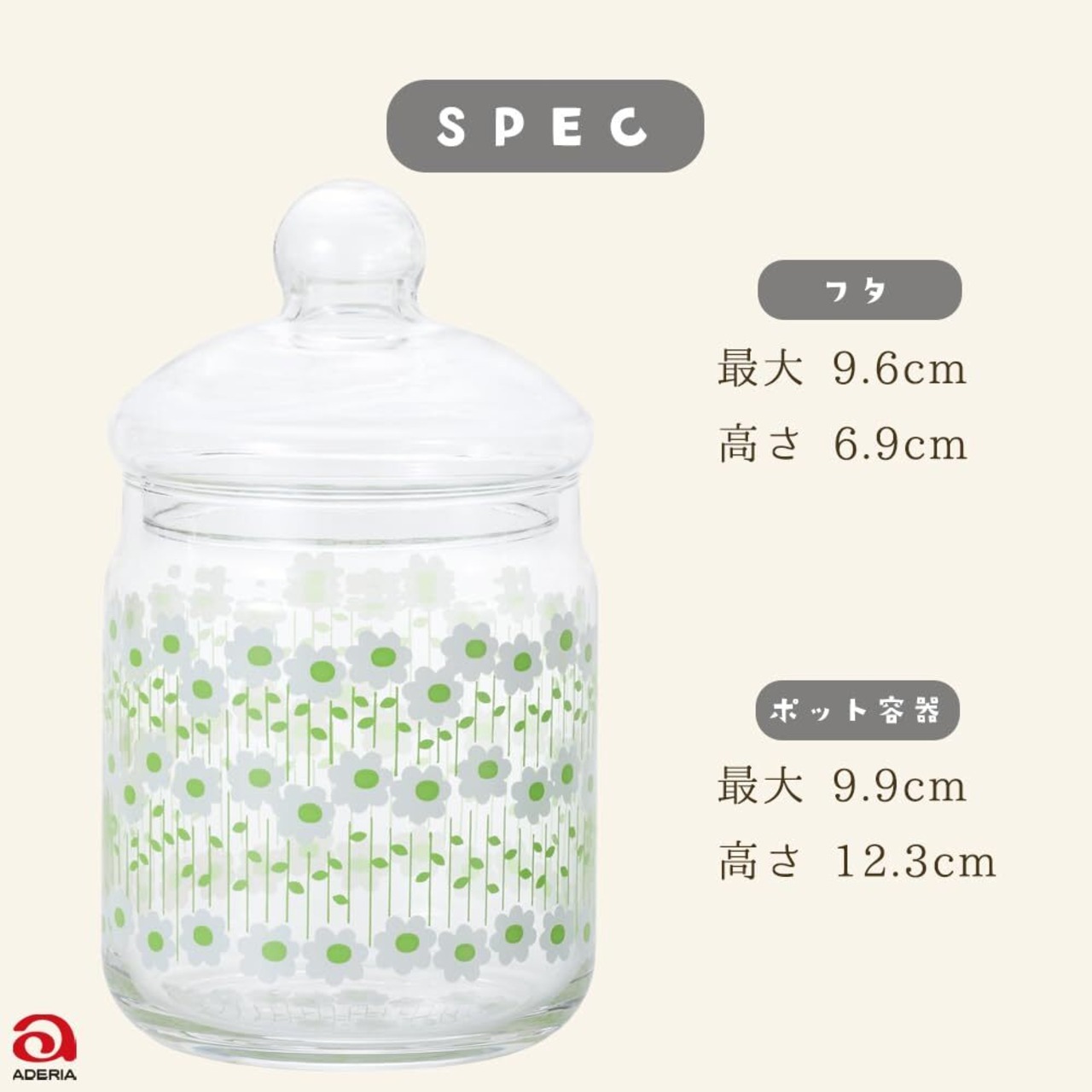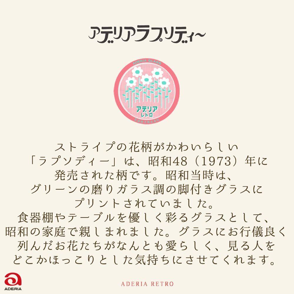 懐かしくて新しい。昭和のカワイイを詰め込んだレトロな器「アデリアレトロ」シリーズ。当時を知る人には懐かしく、知らない人にとってはむしろ新鮮にもうつるガラスのボンボン入れ。チャームポイントのぷっくりした持ち手は、昭和当時に製造していたボンボン入れのデザインを再現したものです。ちなみにボンボンとは一口サイズのチョコレートやキャンディーのこと。昭和の家庭ではこのようなガラスの卓上保存容器は「ボンボン入れ」と呼ばれ親しまれていました。そのかわいらしい見た目から当時はお部屋を飾るインテリアとしても人気があったようです。どこまでも昭和の雰囲気にこだわり、パッケージもレトロでかわいいデザインに仕上げました。このように見た目はレトロですが、自社工場で徹底した品質管理のもとに製造されていますので安心してお使いいただけます。幅広い世代の方に喜んでいただけるプレゼントとしてもおすすめです。[ラプソディー]ストライプを描く花柄がかわいらしい「ラプソディー」は、昭和48(1973)年に発売された柄です。昭和当時はグリーンのすりガラス調の脚付きグラスにプリントされ、食器棚やテーブルをやさしく彩るグラスとして当時の人々に親しまれました。お行儀よく並んだお花たちが何とも愛らしく、見る人をどこかほっこりとした気持ちにさせてくれます。[サイズ](ポット容器680)約最大9.9(口径9)×高さ12.3cm、(フタ)約最大9.6×高さ6.9cm[容量]約680ml[素材・材質]ガラス[生産国]日本
