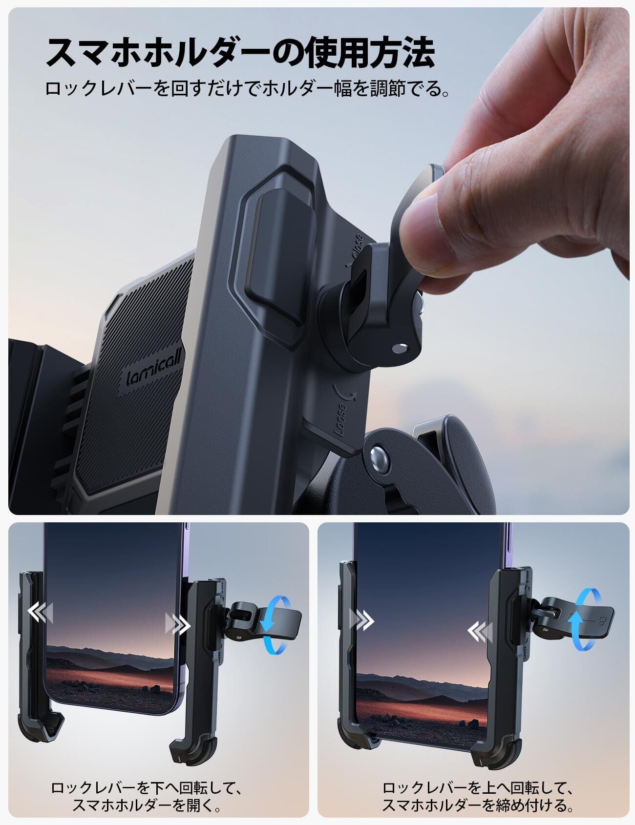 【スマホホルダーの使用方法】まず、スマホホルダーのロックレーバーを回転して、スマホホルダーの両側を開きます。スマホをホルダーに入れ、ロックレバーを回転して、スマホホルダーの両側を引き締めます。スマホの幅より約3-4mm広く調節して、ロックをかける。スマホをガッチリと固定できます。