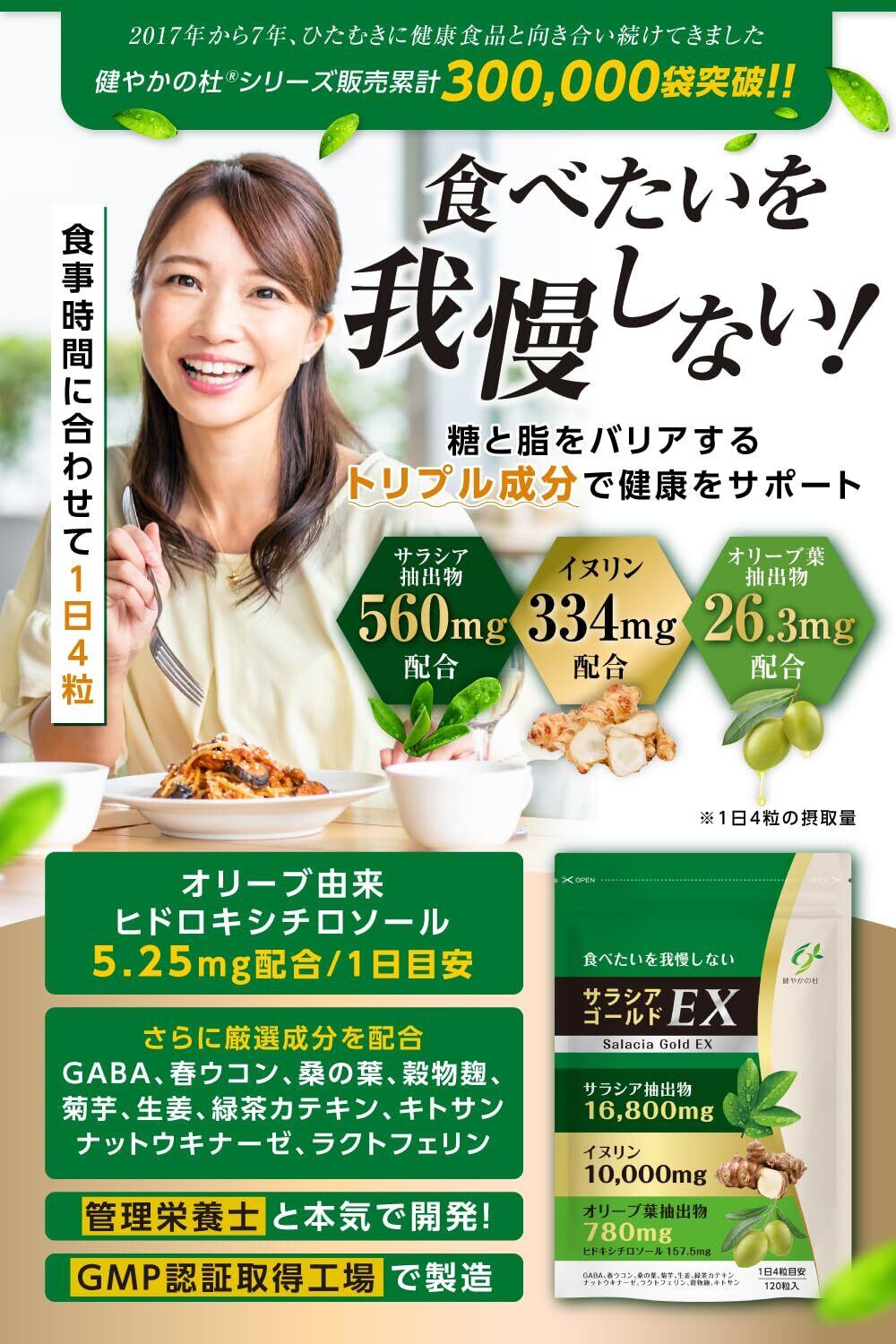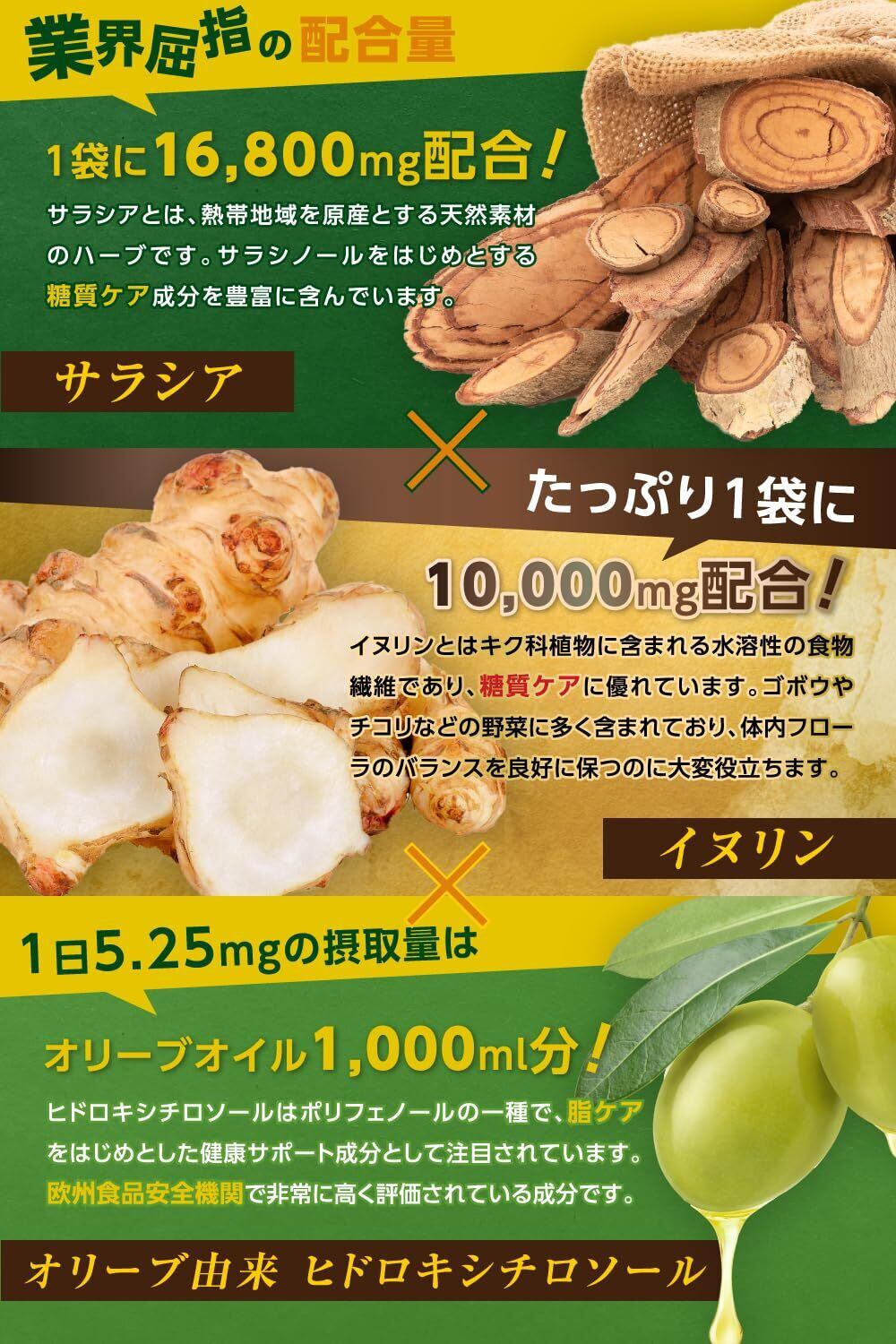【サラシアゴールドの上位版!】「食べたいを我慢しない!」を再びコンセプトに、1袋あたりサラシア16,800mg、イヌリン10,000mg、オリーブ葉780mgのトリプル成分を配合し、糖とバリアをWケアできる商品を開発致しました! サラシアとイヌリンは糖質に、オリーブ葉は脂質にアプローチ致します。オリーブ由来のヒドロキシチロソールもしっかり1日5.25mg配合したサプリとなっております。