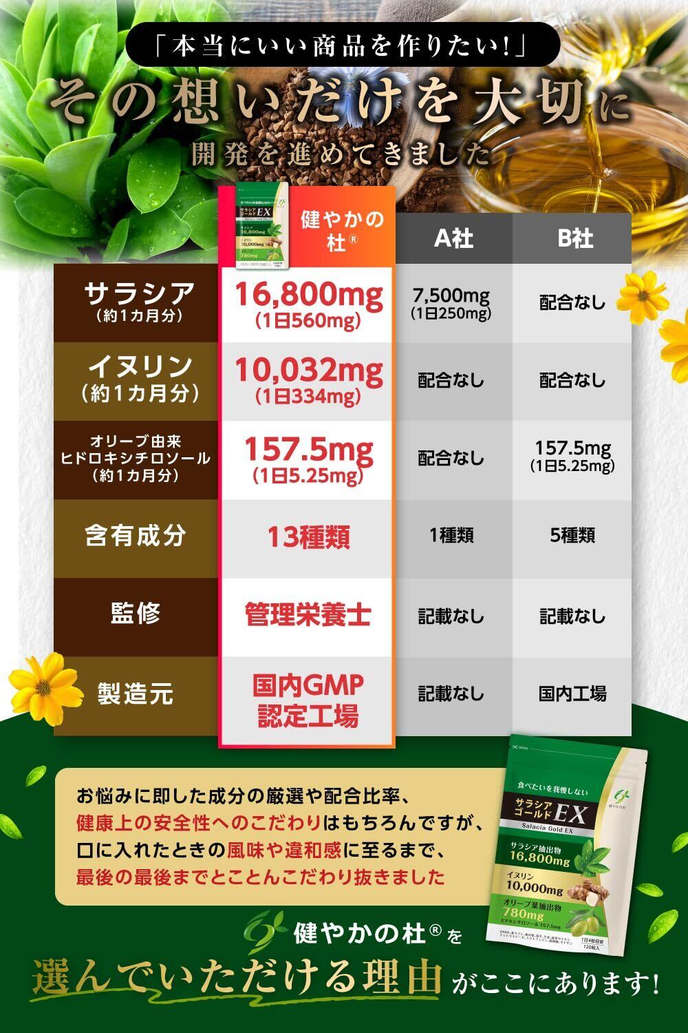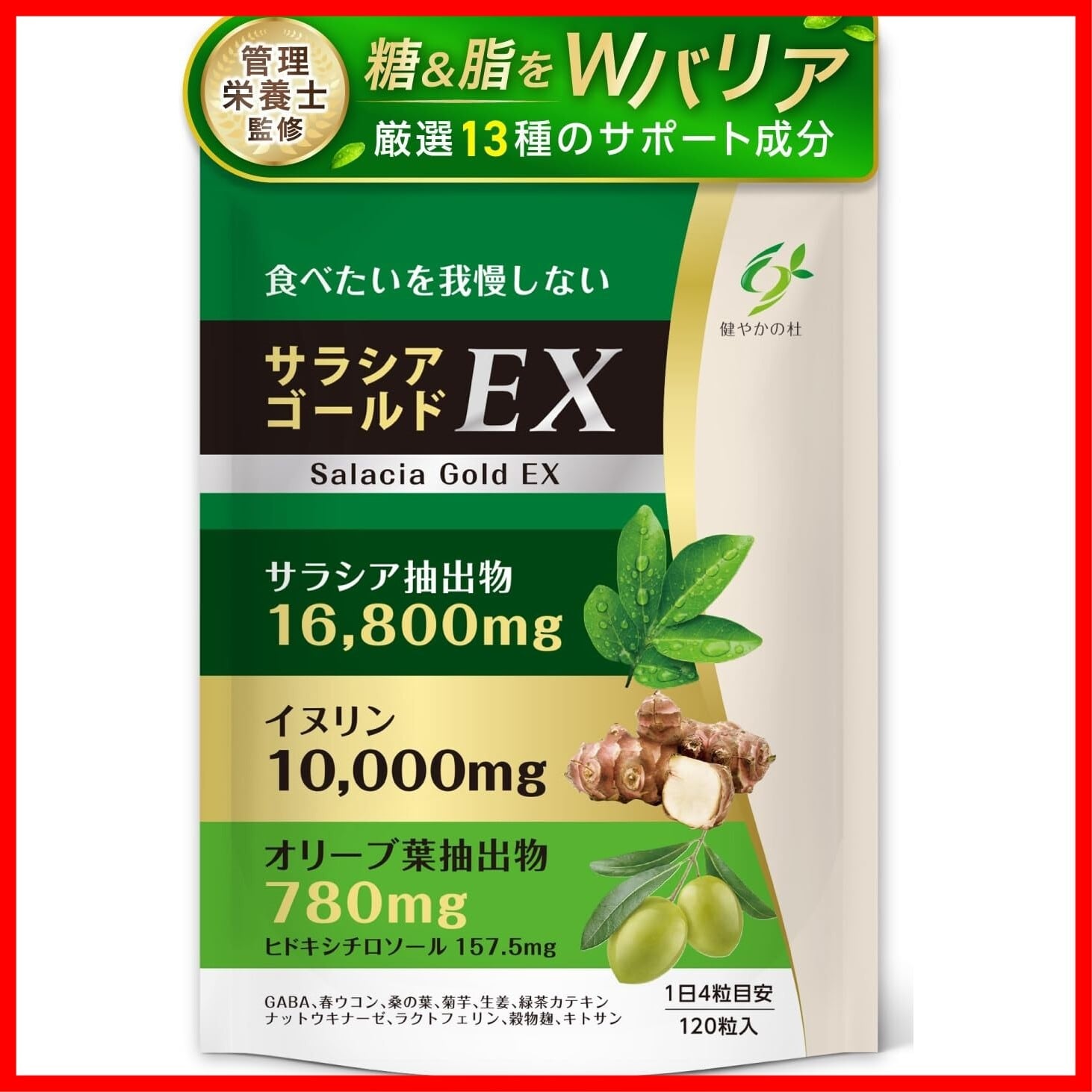 【 糖質 x 脂質 Wケア 】 サラシア 16800 mg イヌリン 10000 mg オリーブ 葉 780 mg GABA 桑の葉 春ウコン 菊芋 食物繊維 サラシアゴールドEX 120粒 30日分 (1袋)