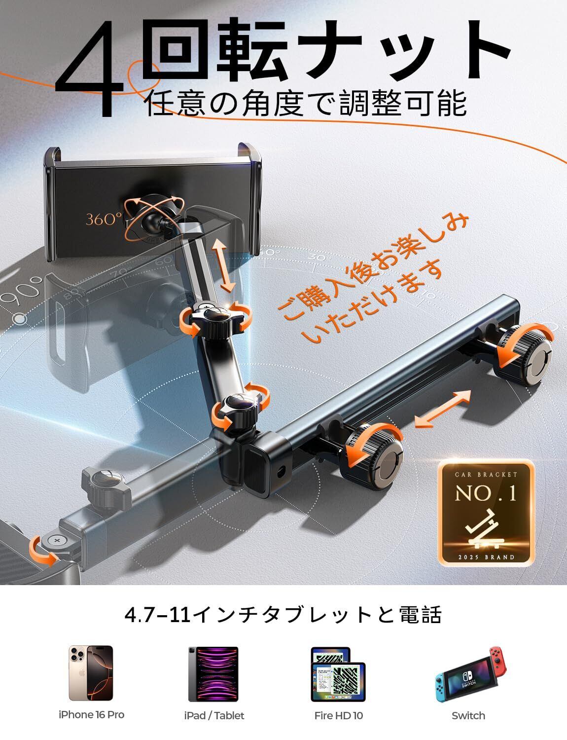 【取り付け簡単&360度回転】通常、ヘッドレスト タブレットホルダーを取り付けるのに3秒、タブレットや携帯電話を挿入するのに2秒しかかかりません。360°回転する車タブレットホルダー後部座席 アルミニウム 角度調整可能により、首が痛くならないように頭を下げずに最適な角度を見つけることができます。車 あいぱっど ホルダー 後部座席折りたたみ可能 特にお子様や女性に優しいスタンドです。