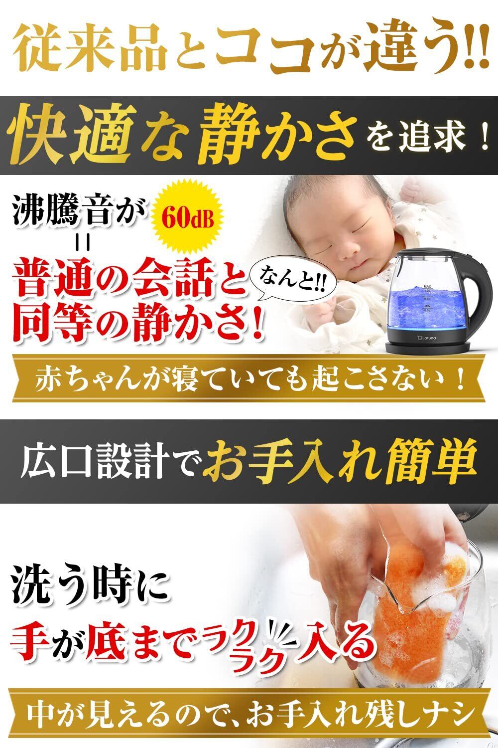 電気ケトル ガラス ケトル 湯沸かしケトル LEDライト付 電気 ポット 電子ケトル 【コップ1杯95秒】 1.0L [Latuna ラチュナ] コーヒー 湯沸かしポット 小型 おしゃれ 紅茶 お茶 空焚き防止 PSE認証済み (ブラック) | hananoki