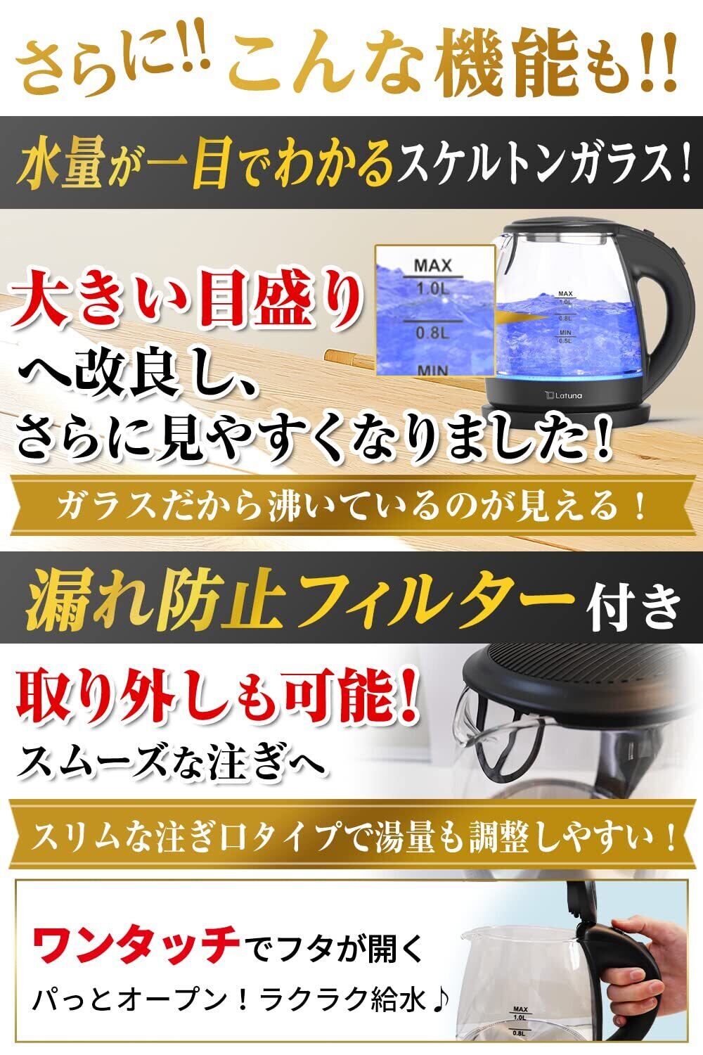 電気ケトル ガラス ケトル 湯沸かしケトル LEDライト付 電気 ポット 電子ケトル 【コップ1杯95秒】 1.0L [Latuna ラチュナ] コーヒー 湯沸かしポット 小型 おしゃれ 紅茶 お茶 空焚き防止 PSE認証済み (ブラック)