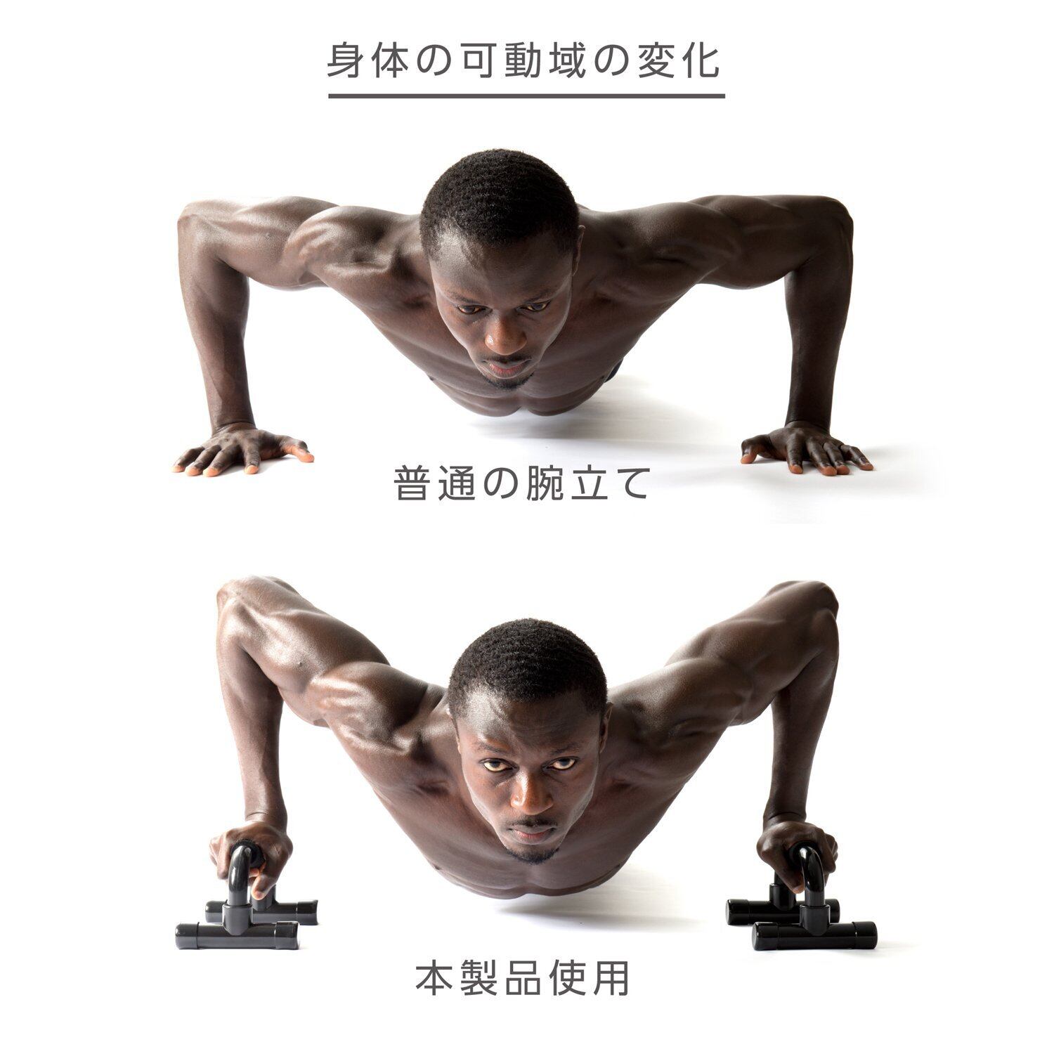 プッシュアップバーを使うことにより、床で腕立て伏せをするよりも深いところまで身体が曲げられるので効果が倍増します。