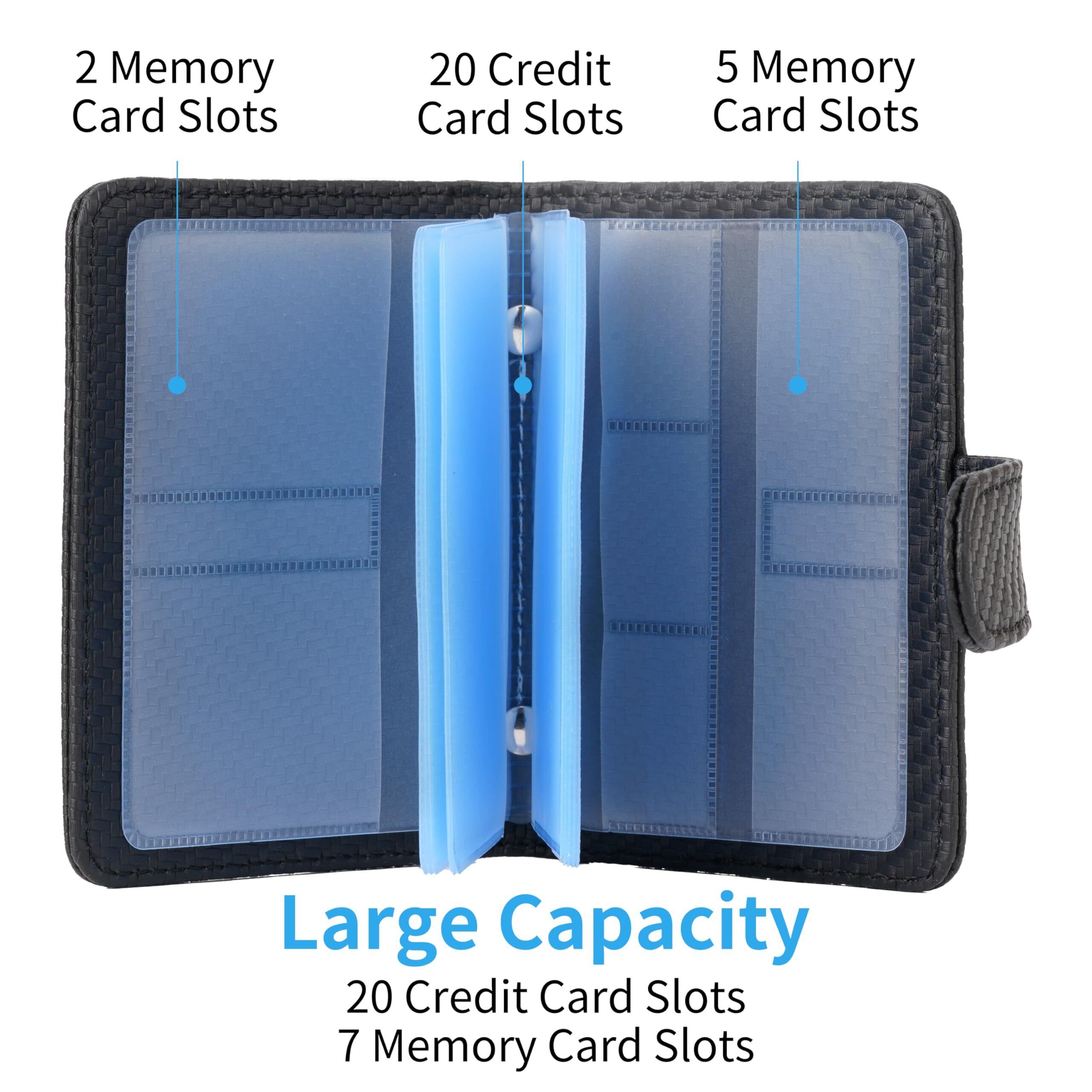 【抜群な収納力】クレジットカード20枚(裏表2枚シートx10ページ)とメモリカード7枚(SD・CF・TF用)を同時にうまく収納できて、わざわざメモリカード専用のケースを購入する必要も要らないです。