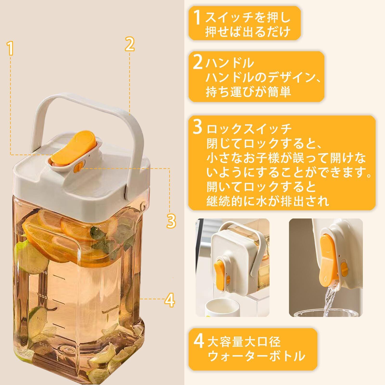 【大容量】麦茶ポット 横置き 3.5リットルの容量で持ち運びに便利です。 アウトドアスポーツやキャンプに欠かせない商品です。 大家族や集まりに最適! 注意:ご使用の際は、ぶつからないようにお願いします。製品にはシールリングが付いています。使用時にずれがないか確認してください。ずれている場合は位置を修正してください。平置きや横置きの際は必ずロックスイッチをOFFにしてください。