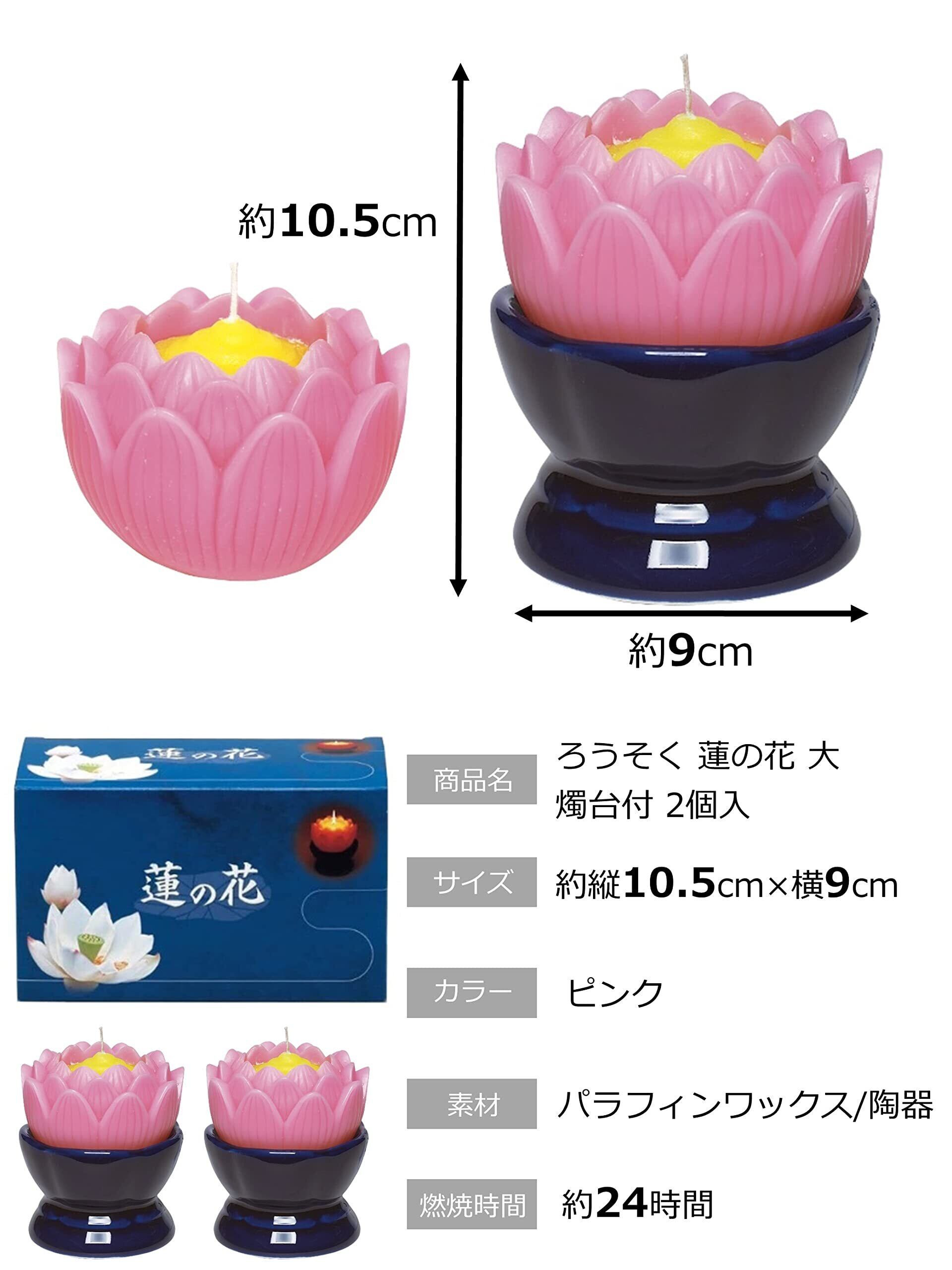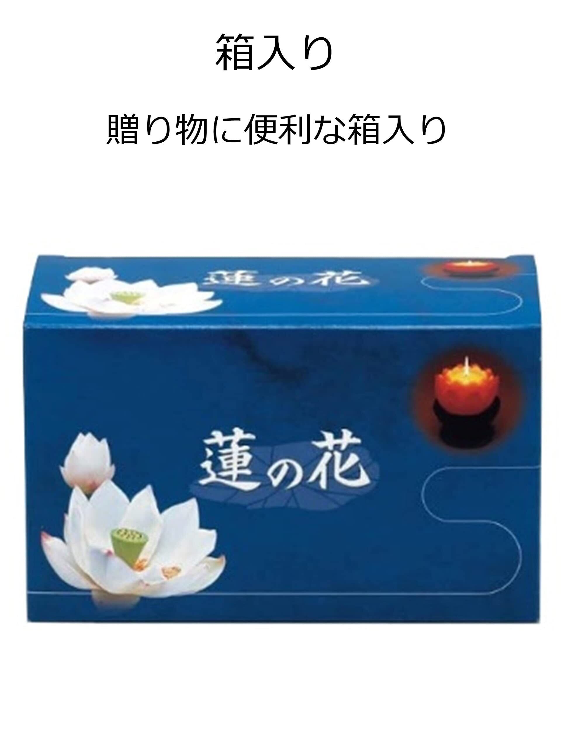 蓮の花をモチーフにしたローソク。便利な燭台付き。毎月のお墓参りに最適。燃焼時間約24時間。
