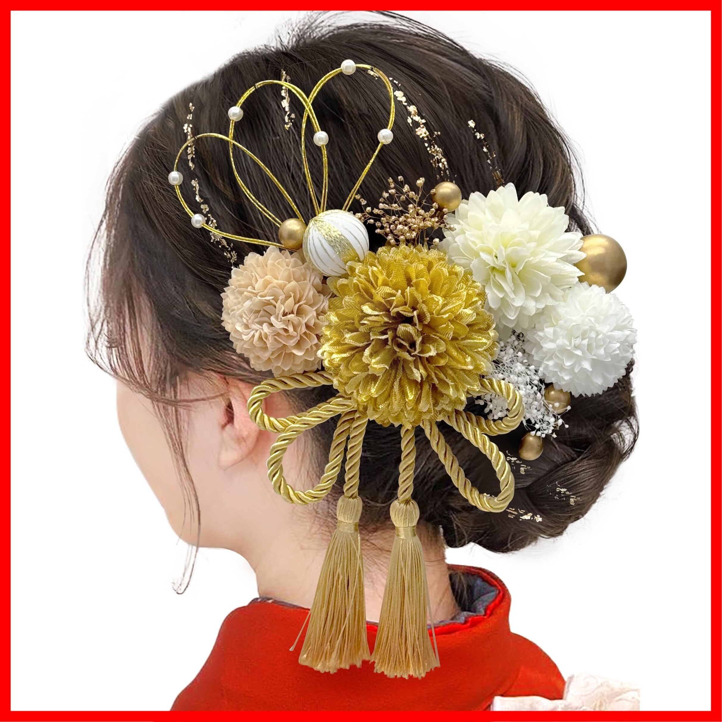 【ユニークなデザイン】伝統と現代の要素を融合しているデザインです。この髪飾りは金色の結び水引とかすみ草がエレガントな形に編み込まれ、アンティークベリーと和玉が間を彩っています。精緻なピンポンマムとの組み合わせが、ラグジュアリー感をプラスしています。合計12カラーが選択可能です。