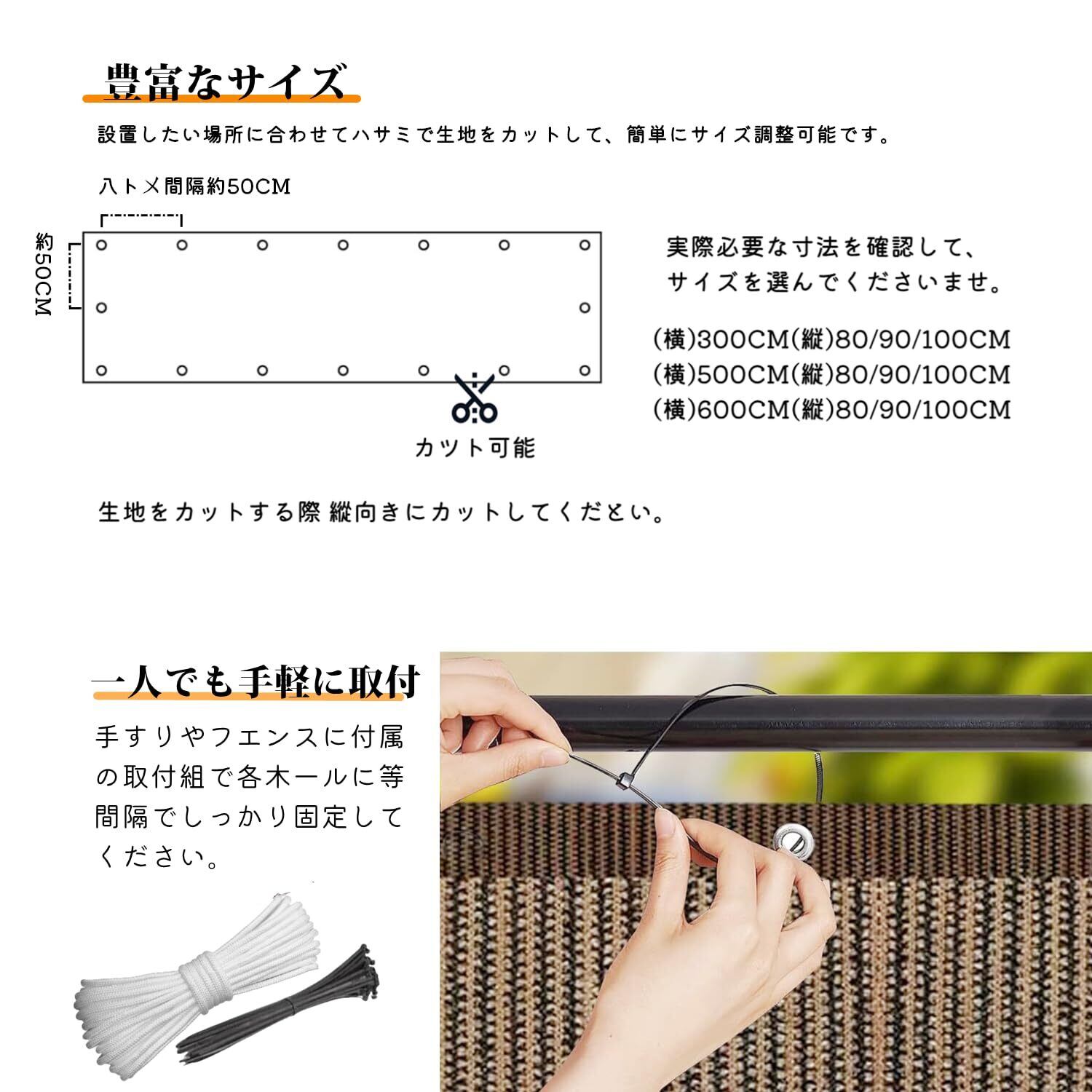 ️【簡単な取り付け】多孔質の目のデザインで、四辺に十分な数のハトメ穴があります。強い生地で遮蔽性も優れており、白い紐が付属しています。ハサミを使ってカットできるため、柵の範囲に合わせて調整し、さらに自由なセッティングが可能です。取り付けは簡単で、汚れても水洗いでき、手入れが簡便です。自然な形状記憶加工により、折りたたみ時のシワも自然に戻ります。シーズンオフにはコンパクトに折りたたんで収納できます。