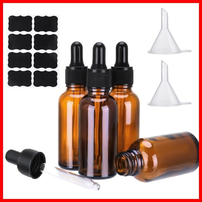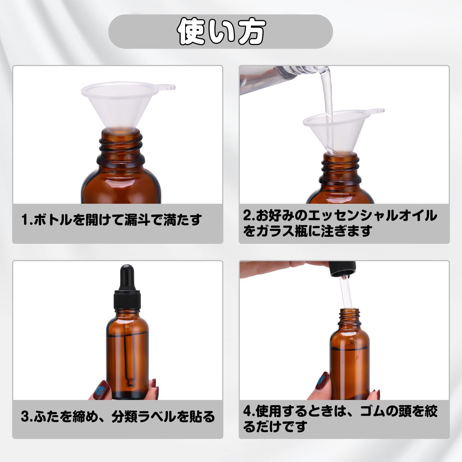 【セット内容】茶色の遮光瓶4本、じょうご2個、シール1枚。容量:30ml。寸法: 長さ 104mm、底の直径 33mm。材質:ガラス(ボトル)、PP+ゴム(キャップ)。