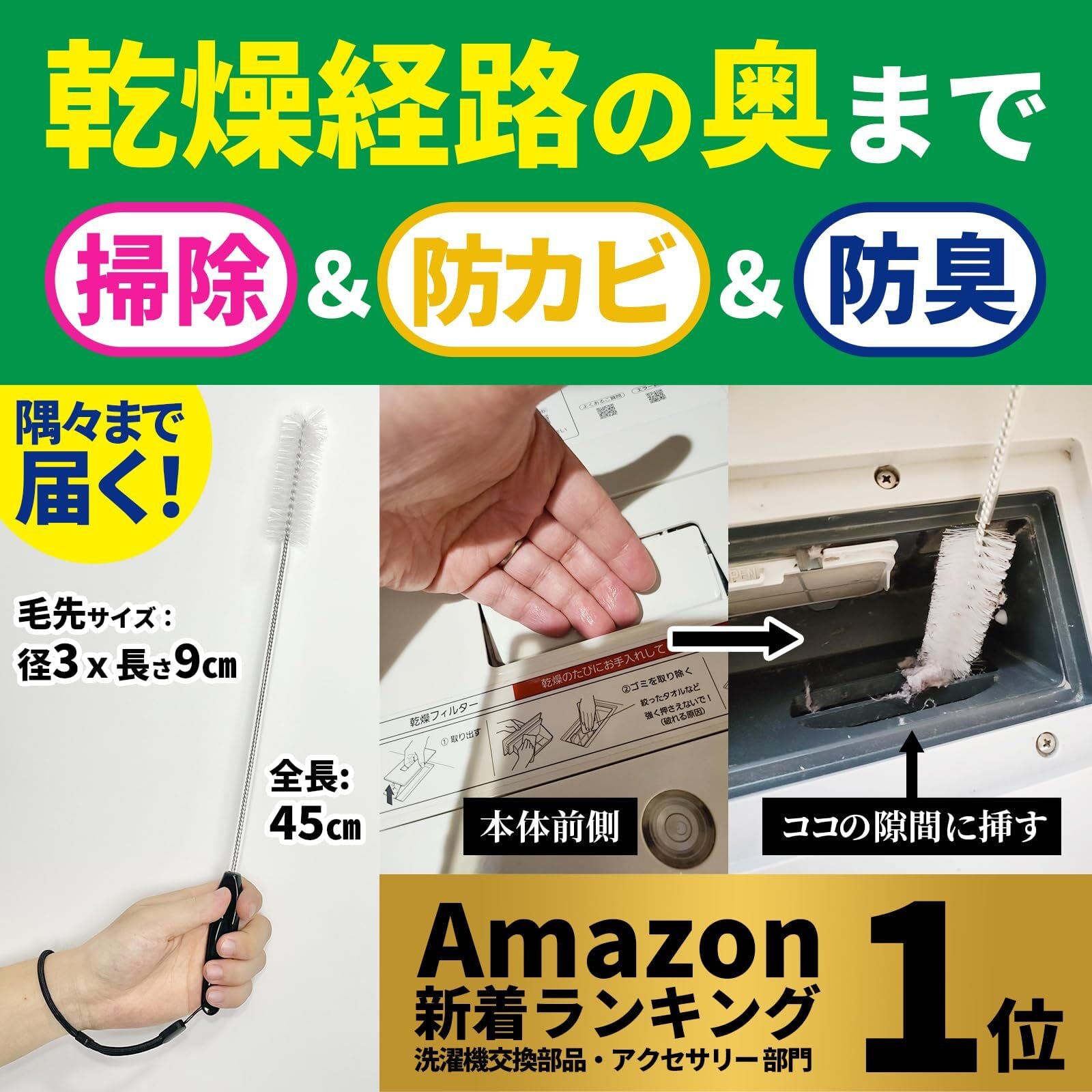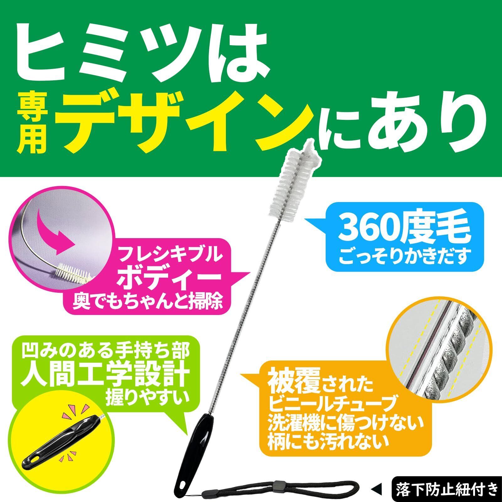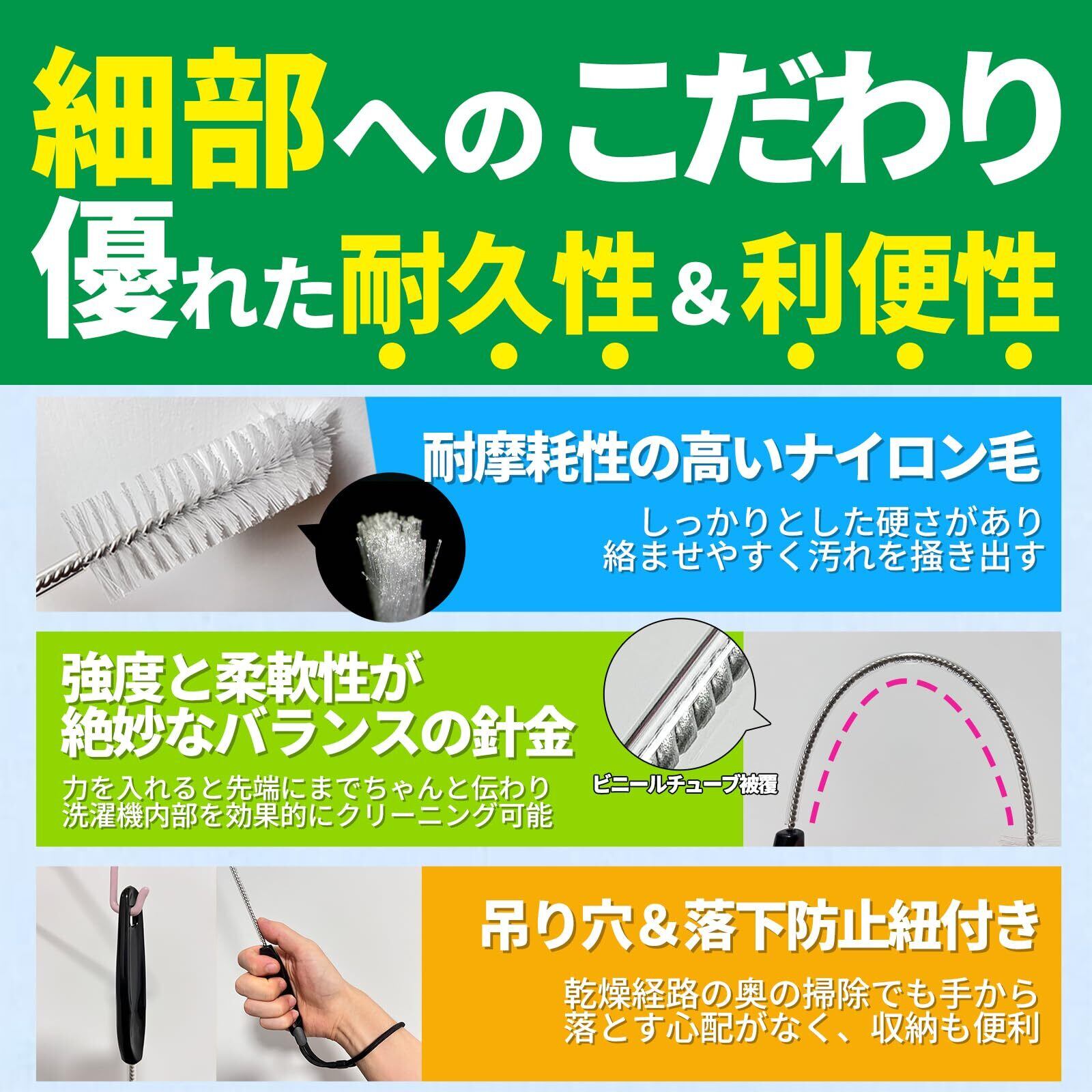 細部へのこだわり:●落下防止紐付き 乾燥経路を掃除する時は付属の落下防止紐を取り付け、手首に固定するとウッカリが防げ、収納の際も活躍します。●フレキシブル柄 ブラシのアームの強度と柔軟性は絶妙なバランスで共存しており、奥まで押し込んでも針金でフレシキブルに曲がりますが、適度なしなりがあるので、掃除がしやすいです。●ビニールチューブ被覆 ブラシのない針金部分は、上質なビニールチューブで包まれており、簡単に破れそうもなく、隙間に入れ込んでもゴムや洗濯機本体に傷つけることもなく、針金部分に汚れが付着しないので、衛生的でもあります。●人間工学デザイン 持ち手の部分は凹みのあるしっかりと握りやすいデザインになっています。