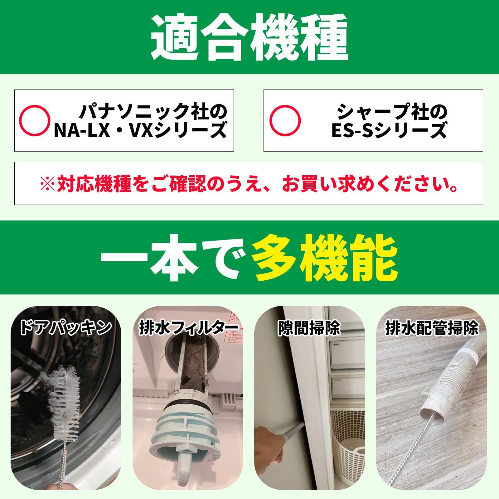 一本で多機能:一本だけで、乾燥経路からドアパッキン、糸くずフィルター、乾燥フィルターや排水パイプまで掃除でき、洗濯機に限らず、手の届かない細かな場所で使えるのがとても便利です。
