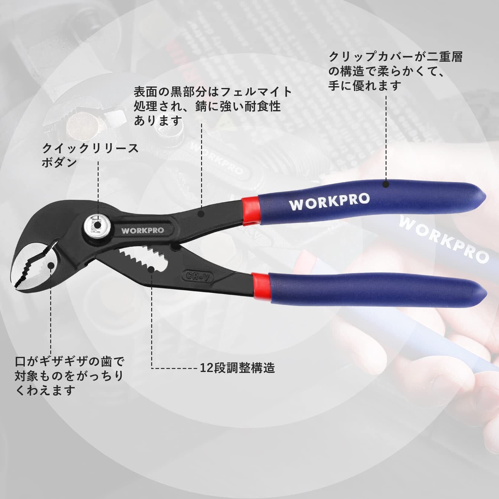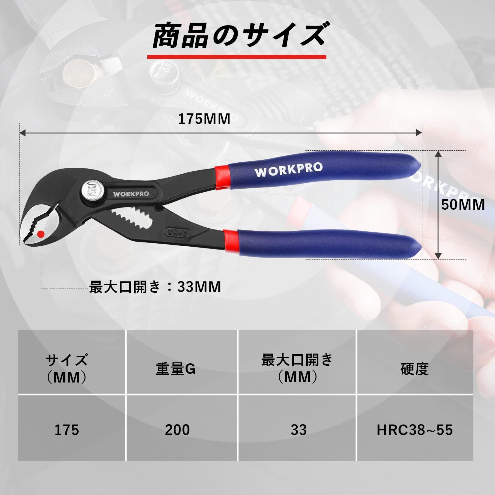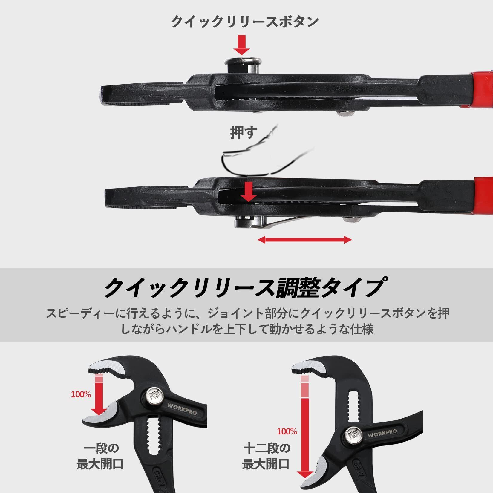 WORKPRO ウォータポンププライヤー 12段調整構造 全長175mm クイックリリース調整タイプ