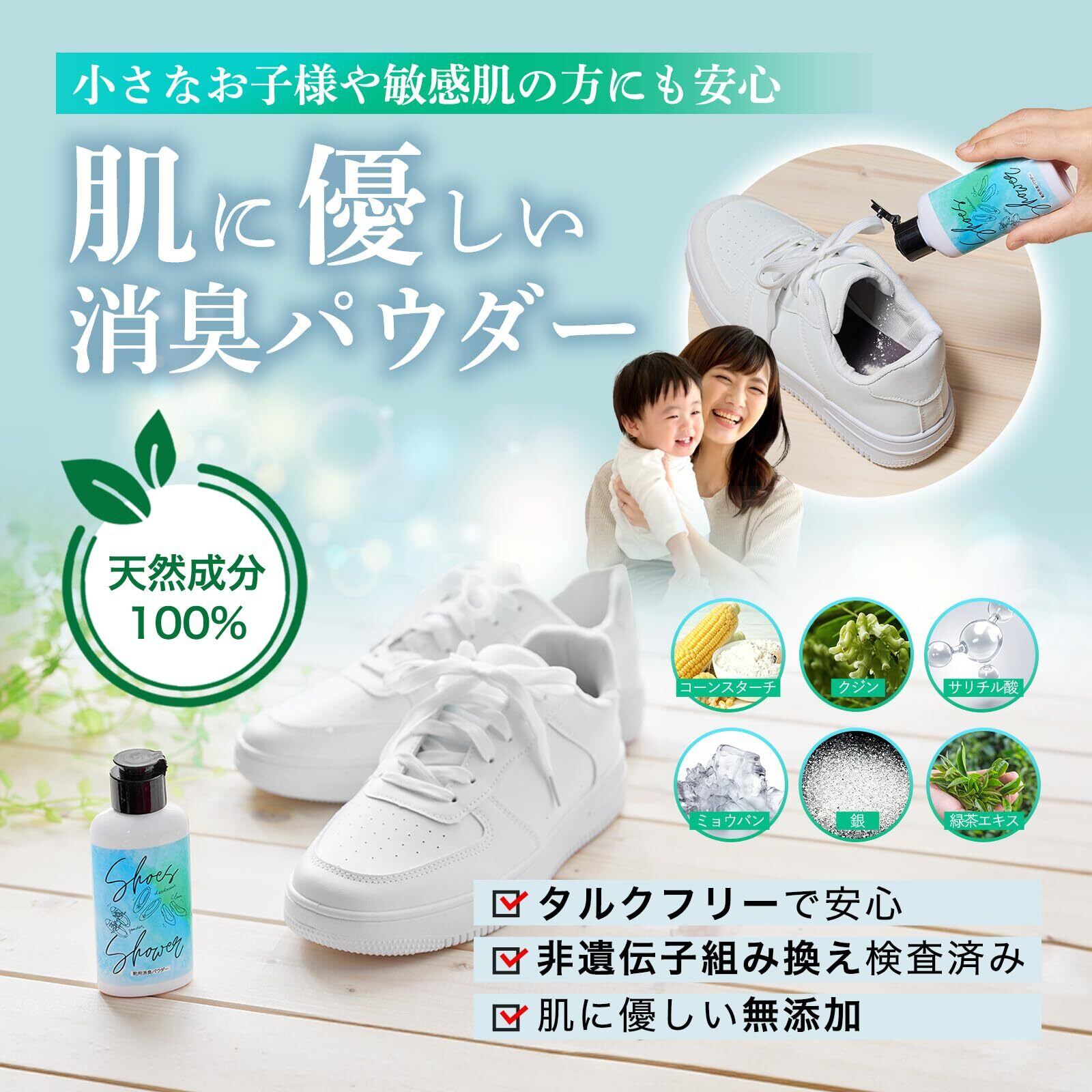 足元の悩みを解決する「Shoes Shower 消臭パウダー」で、あなたの日常をもっと快適に。【悪臭98%カット】の実証済みの靴消臭パウダーは、独自配合で強力・迅速・持続する消臭力を提供します。強力な6つの消臭成分(コーンスターチ、クジン、サリチル酸、ミョウバン、銀、お茶エキス)を配合した当製品は、足の臭いはもちろん靴下のニオイにも対応。銀とお茶エキスの二重の抗菌作用で悪臭の原因を根本から断ち切ります。