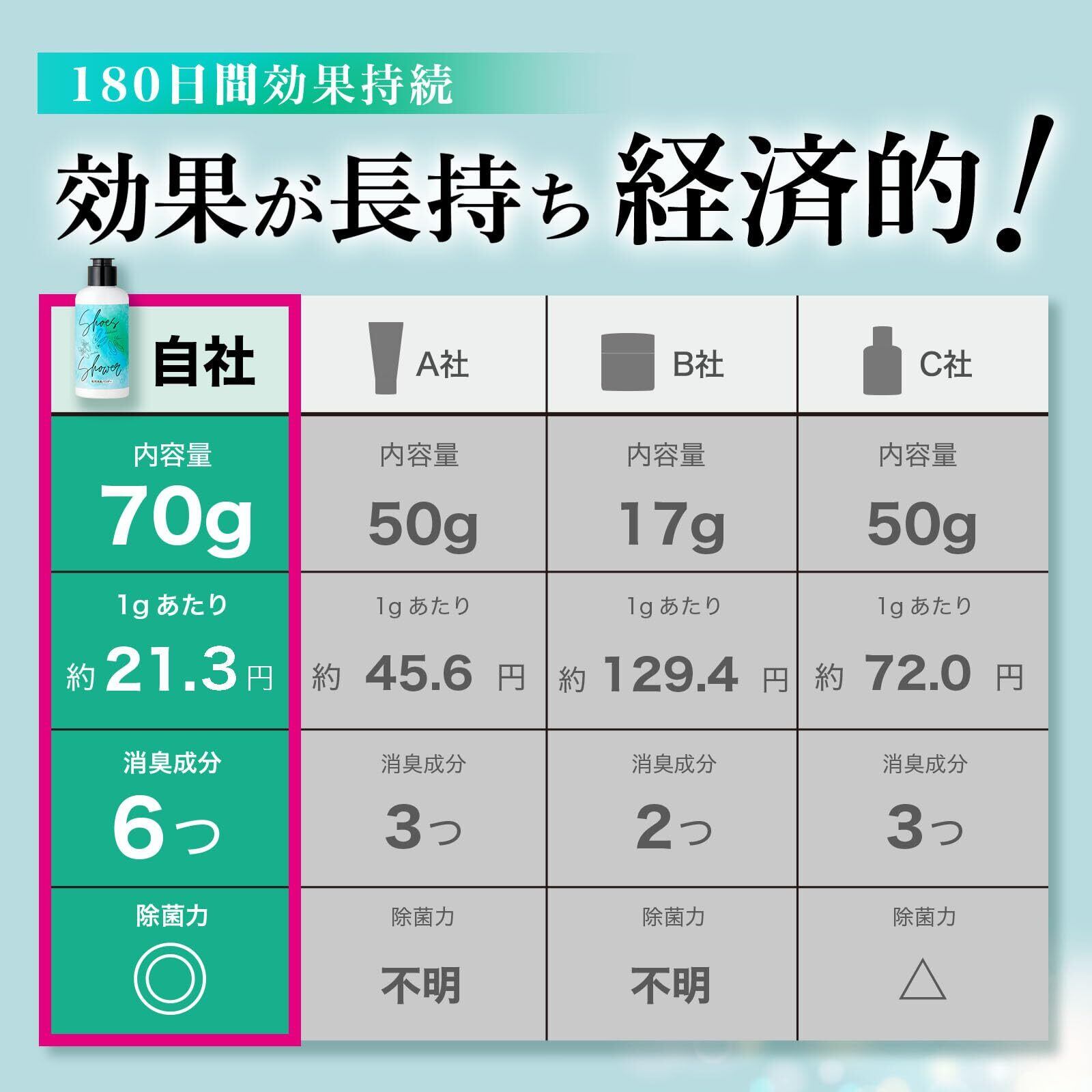【経済的で長期的な効果】:1週間程度継続して使用することで、最大180日間消臭効果が続きます。70gの大容量でコストパフォーマンスに優れています。定期的な買い替えの手間を減らし、経済的負担も軽減します