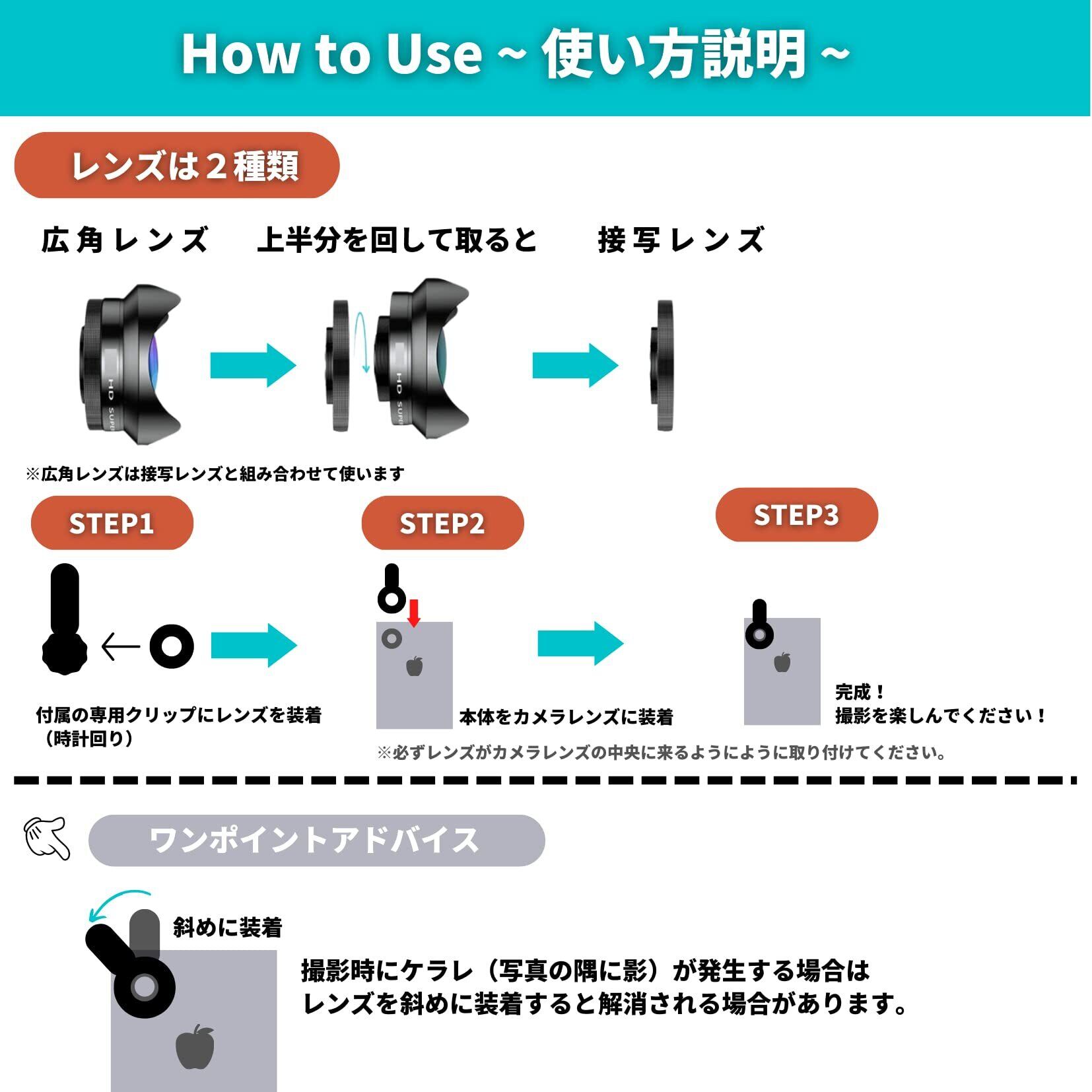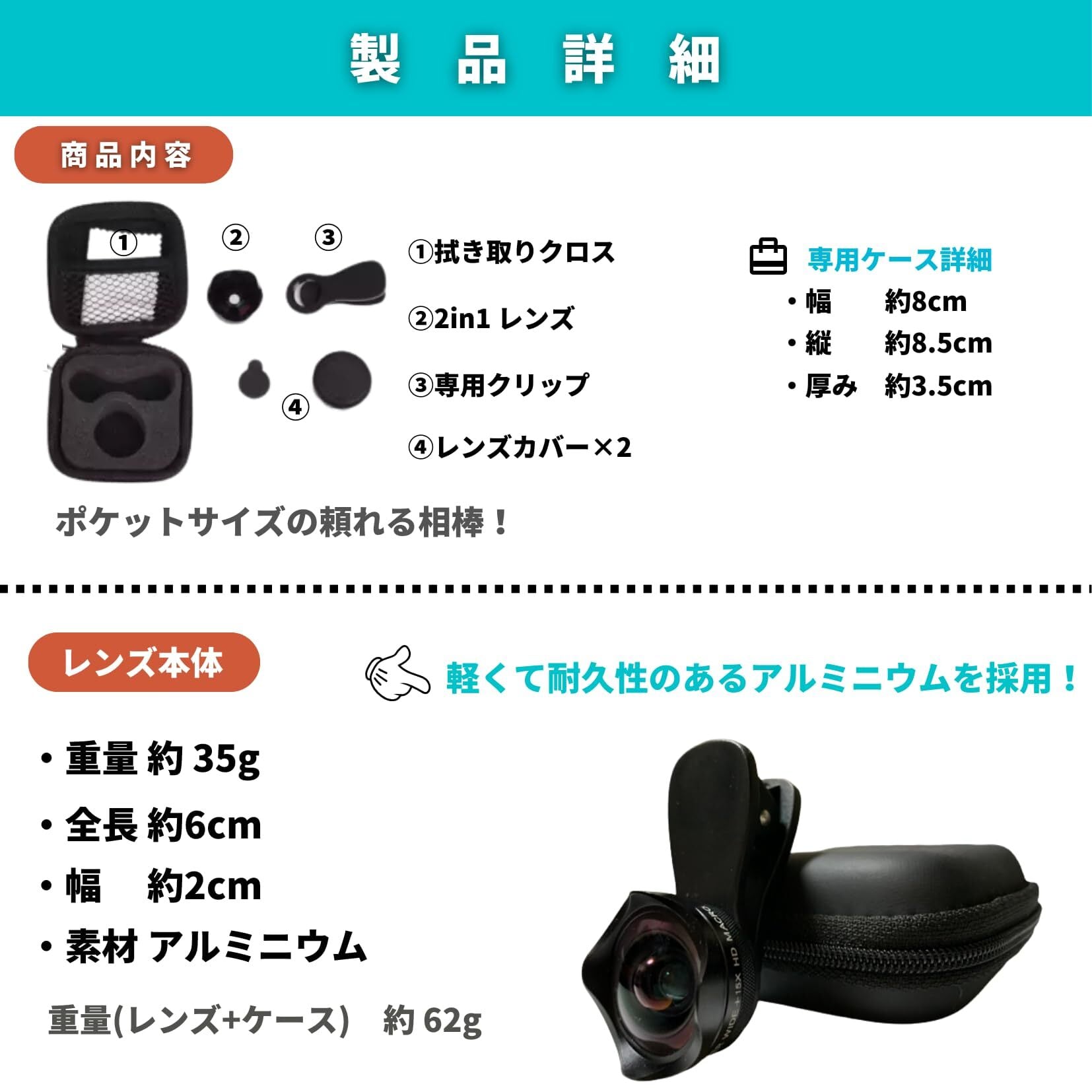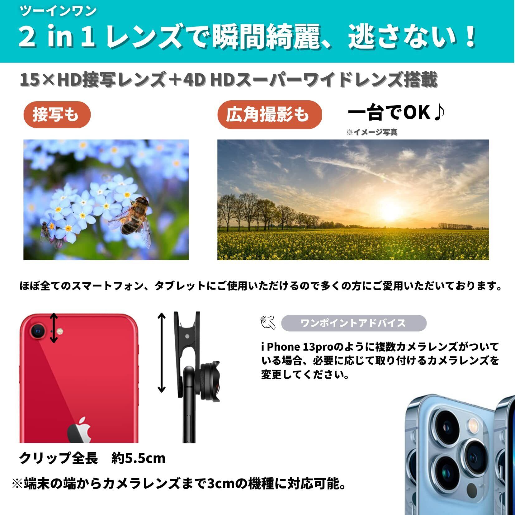 【2in1レンズ】4KHDスーパーワイドレンズ+15倍のマクロレンズを搭載した2in1スマートフォン用レンズです。より広い範囲が撮影可能なワイドレンズ、手元まで綺麗に撮れる接写レンズキット。歪みの無い高画質写真が簡単に撮れてワイドもマクロもこれ一つでOK。インスタグラムやツイッターなどSNSの投稿はもちろん、結婚式や運動会、旅行や登山、集合写真にも最適なカメラレンズキットです。対応機種: iphoneや Android、ipad全般。iphone12 / iPhone12 pro / iPhone11/ 11pro / iPhoneXS /XS max / iPhone XR / iPhone X/iPhone6S/5S/7/7plus iPad iPhone 5C/5S/5E/Samsung Galaxy S6/S5、HTC、Sony Xperia Z4/Z5、Huawei P30 liteやアンドロイドスマホに対応。
