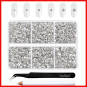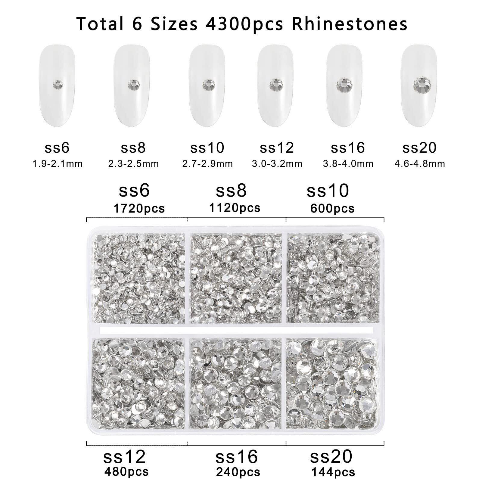 1箱パック、6サイズ計4,300個のホワイト ネイル ラインストーン入り、ピンセットと小さなラインストーンピッキングペン付き。メイン写真のアクリルネイルは含まれていません。小さいサイズのネイルラインストーンを見せるために使われているだけです。