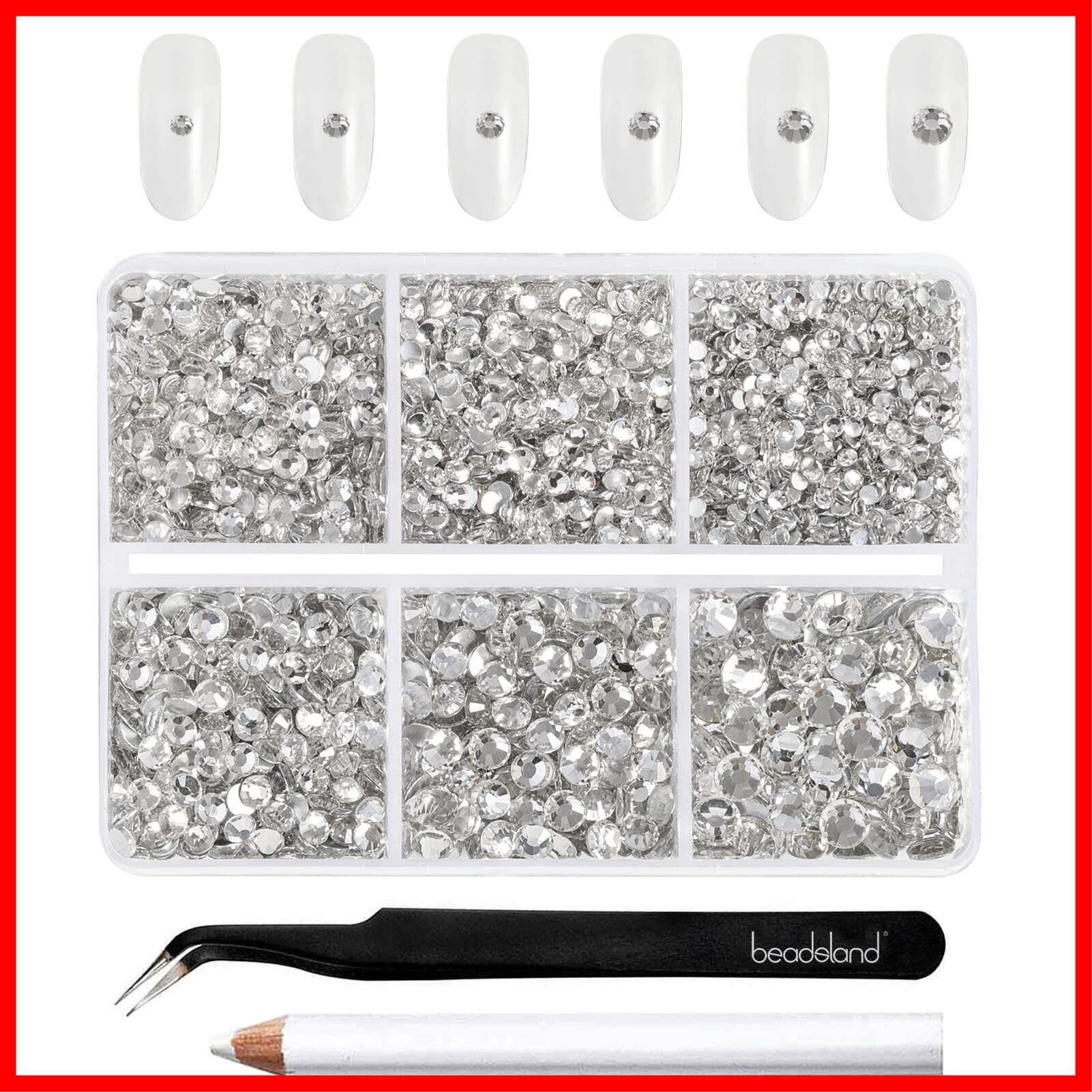 Beadsland(ビーズランド)4,300個 フラットバック ラインストーン ホワイトのラインストーン ネイル用ジェム ラウンド クリスタルラインストーン 手工芸用 6サイズ混合 ピンセットとワックスペンシルキット付き、SS6-SS20、クリスタル