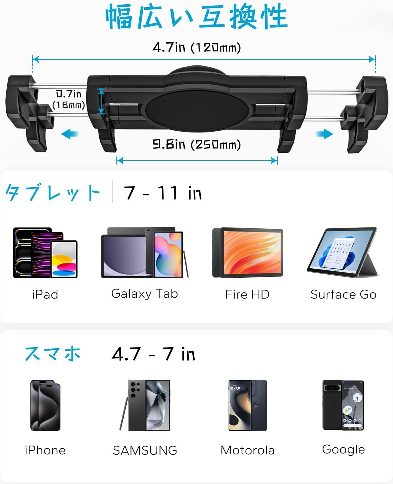 【多機種対応】このバックミラータブレットマウント調節可能なクリップアームは、4.7~11インチのすべてのスマートフォンとタブレットに対応しています。新しい iPad Pro 9.7 / 10.5 / 11, iPad Air 2, Air 3, Air 4, iPad Mini 1/ 2 / 3 / 4 / 5, iPhone 15, 15 Pro max, 15 Plus, 14 Pro, 14 Pro max, 13, 13 Pro / 13 Pro Max, X, XS, XR, XS Max, 8, 8 Plus, Galaxy Tab/ Galaxy Note/ Galaxy S24およびその他の携帯電話またはデバイス。