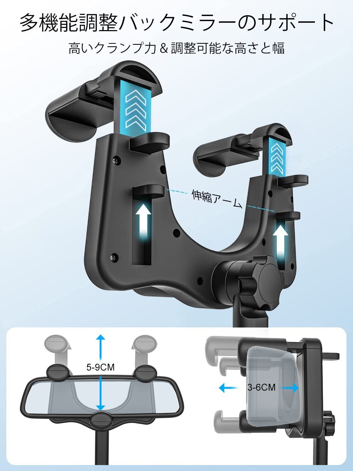 【360度回転&完璧な視野角】バックミラーカーマウントは360度回転でき、縦向きと横向きの両方のモードでタブレットや携帯電話をあらゆる角度から見ることができます。車載タブレット マウントには回転伸縮式アームがあり、視界を遮ることなくタブレットを任意の角度に調整できます。伸縮アームを使用すると、アームの長さを 130mm から 180mm に伸ばすことができます。あなたとタブレットの間の距離を調整することは非常に便利です。