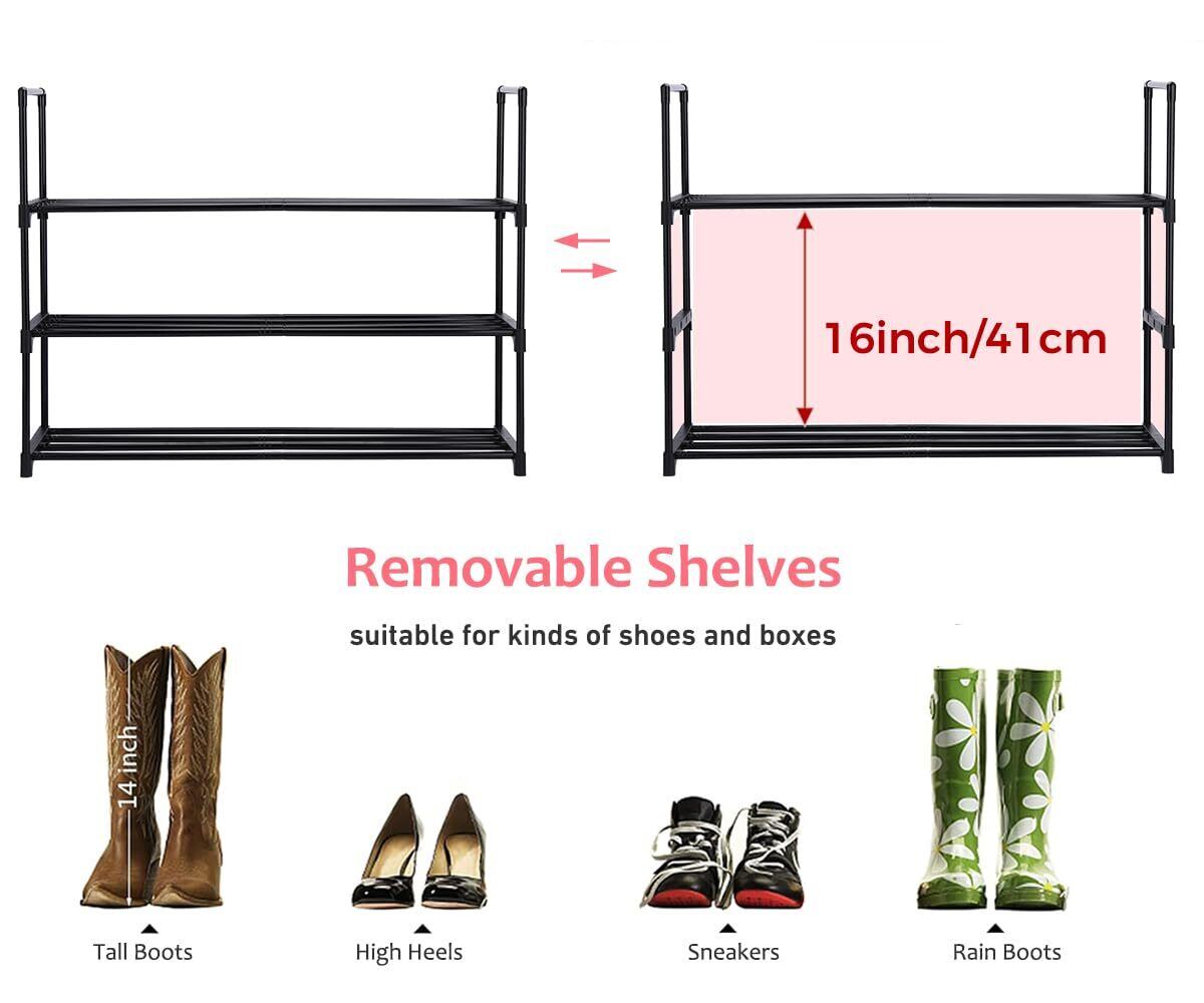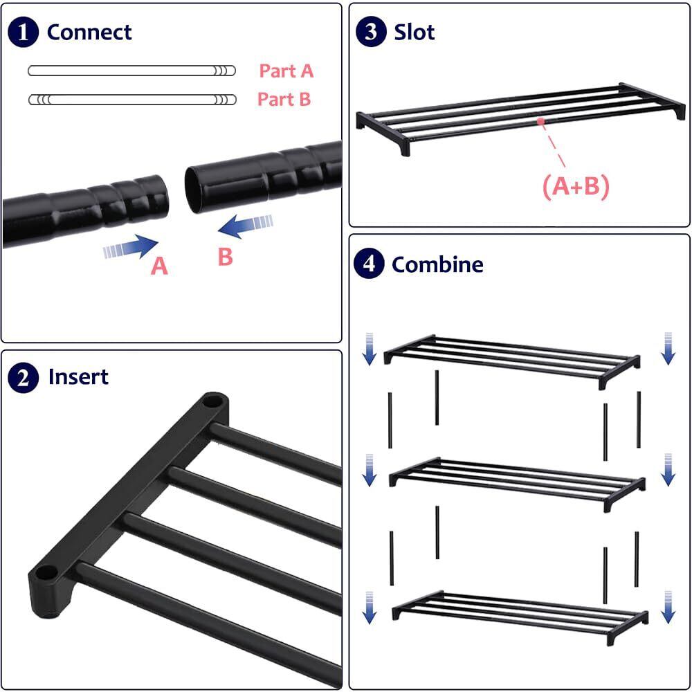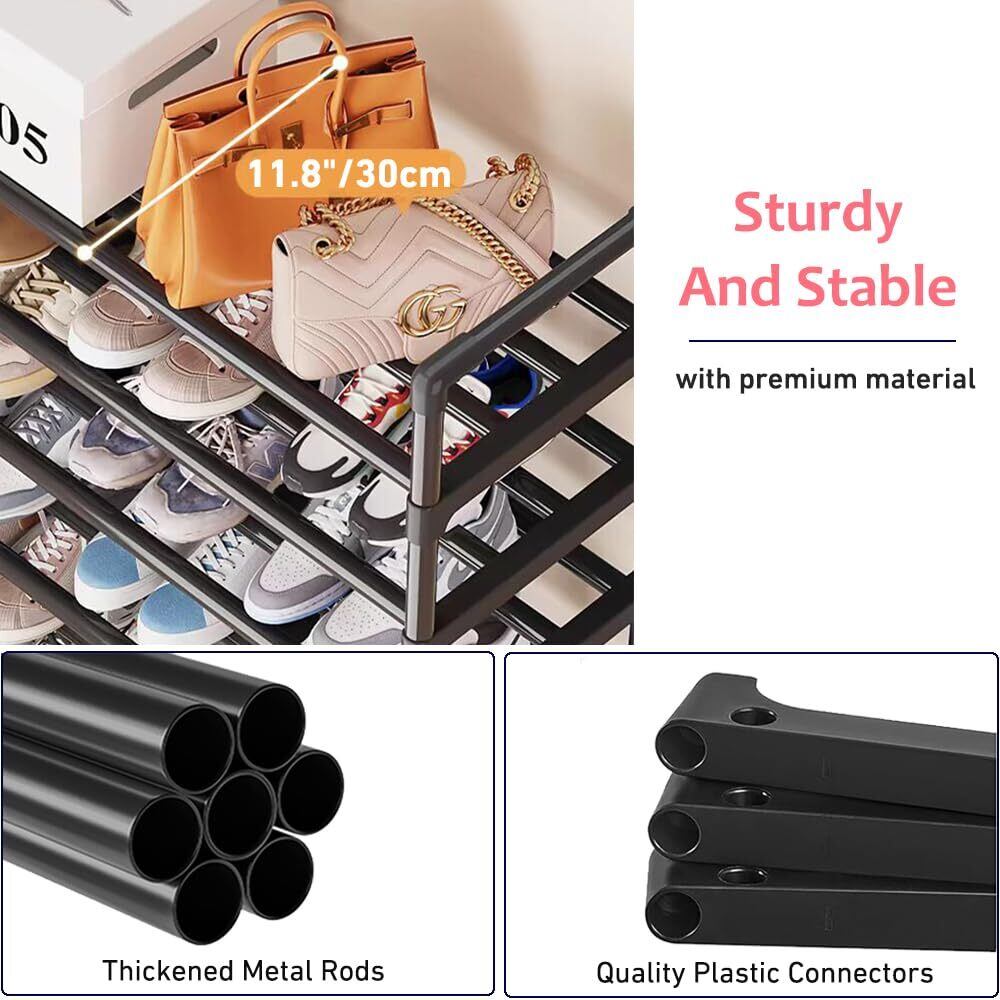 【耐久性のある素材】このシューズオーガナイザーは、耐久性と安定性を確保するために、厚い金属パイプと高品質のプラスチックコネクタで作られています。頑丈な金属フレームは、時間の経過とともに崩れるのを防ぎ、靴に信頼できる家を提供します。